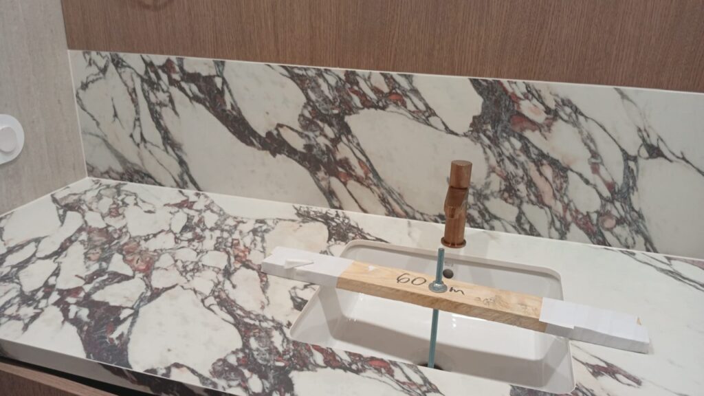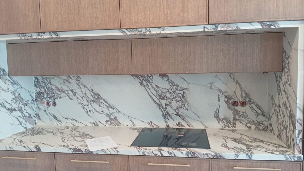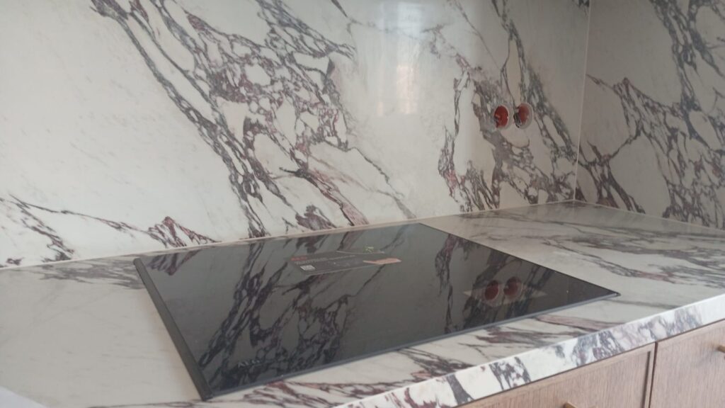 Die Arbeitsplatten wurden passgenau in die Küchenmöbel integriert – mit höchster Präzision und Liebe zum Detail. Dank ihrer Beständigkeit gegen hohe Temperaturen, Kratzer und Flecken vereint die Franko Arabescato Viola Ästhetik und Funktionalität auf höchstem Niveau.