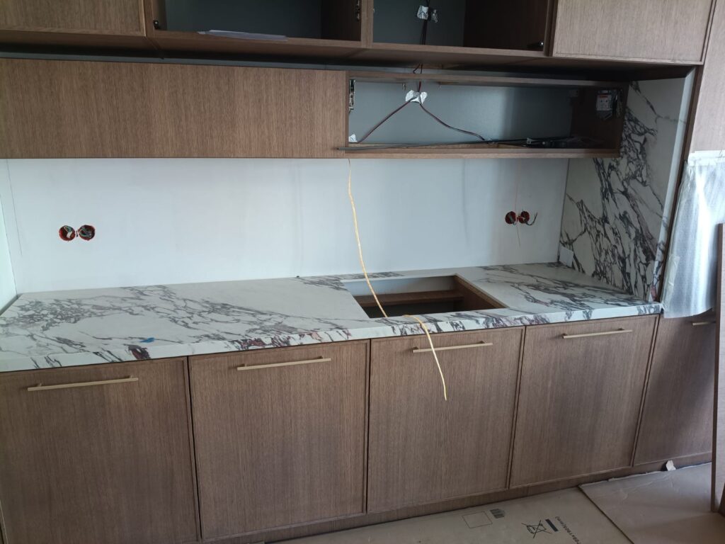 Bei unserem Kunden haben wir eine komplette Installation von Küchenarbeitsplatten aus Keramik Franko Arabescato Viola durchgeführt. Dieses Material, bekannt für seine elegante Maserung und hohe Widerstandsfähigkeit, unterstreicht perfekt den modernen Charakter der Küche. Alle Elemente wurden präzise zugeschnitten und sorgfältig verarbeitet, sodass eine hochwertige Optik und langfristige Haltbarkeit gewährleistet sind. Die Umsetzung erfolgte nach höchsten Qualitätsstandards, und das Endergebnis entsprach voll und ganz den Erwartungen des Kunden.