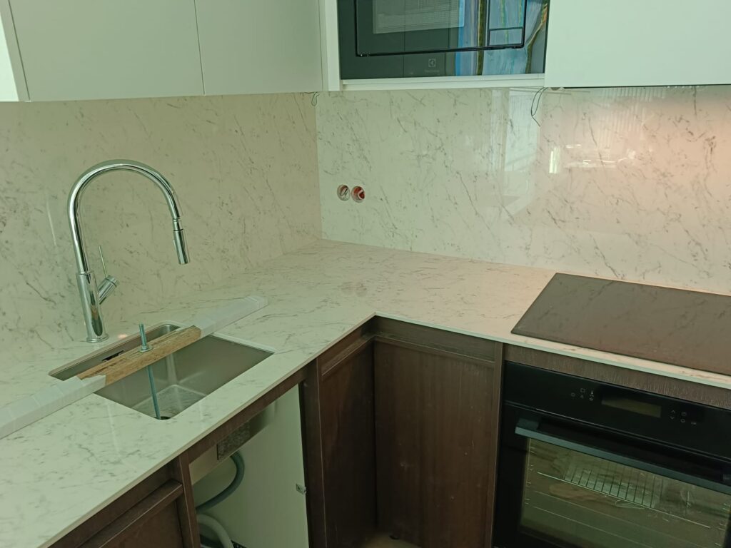 Im Rahmen der Realisierung bei unserem Kunden haben wir elegante und moderne Küchenarbeitsplatten aus Keramik Franko Carrara montiert. Jedes Element wurde präzise angepasst, um sowohl Ästhetik als auch Funktionalität der Küchenräume zu gewährleisten. Durch die Verwendung von Keramik zeichnen sich die Arbeitsplatten durch hohe Kratzfestigkeit, Hitzebeständigkeit und einfache Pflege aus, was den Nutzungskomfort erheblich steigert.