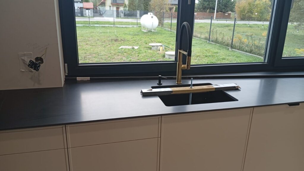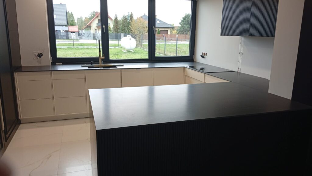 Bei unserem Kunden haben wir Küchenarbeitsplatten aus Keramik Franko Nero Venato montiert. Dieses edle Material besticht durch seine tiefdunkle Farbe und die feine, marmorierte Struktur, die dem Raum eine moderne und zugleich zeitlose Ausstrahlung verleiht. Die präzise Anpassung der Elemente sowie die sorgfältige Verarbeitung der Kanten gewährleisten nicht nur eine hohe Ästhetik, sondern auch Langlebigkeit und Funktionalität über viele Jahre. Das Endergebnis fügt sich harmonisch in die gesamte Kücheneinrichtung ein und unterstreicht deren exklusiven Charakter.