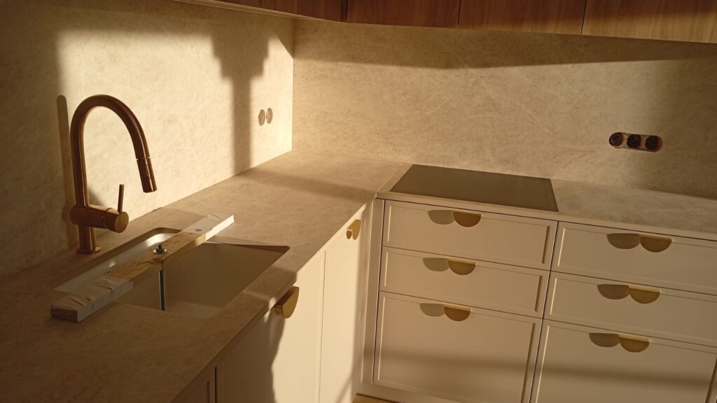 Bei unserem Kunden haben wir Küchenarbeitsplatten aus Keramik Franko Taj Mahal Extra fachgerecht installiert. Dieses außergewöhnliche Material, inspiriert von natürlichem Stein und geprägt durch eine dezente, elegante Farbgebung, passt ideal zu modernen und hochwertigen Innenraumgestaltungen. Die Arbeitsplatten wurden präzise zugeschnitten und alle Kanten sowie Verbindungen sorgfältig verarbeitet, um ein makelloses Erscheinungsbild und hohe Funktionalität zu gewährleisten. Die gesamte Umsetzung erfolgte nach höchsten Qualitätsstandards und das Endergebnis erfüllt die Erwartungen des Kunden vollständig.