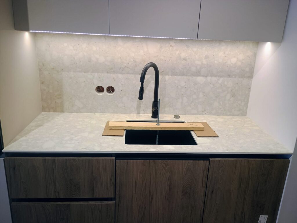 Bei unserem Kunden haben wir die Küchenarbeitsplatten und die Wandverkleidung aus Keramik Neolith Retrostone montiert. Dieses hochwertige Material zeichnet sich durch seine außergewöhnliche Haltbarkeit, Hitzebeständigkeit und Kratzfestigkeit aus und überzeugt durch eine elegante, steinartige Optik. Dank präziser Anpassung und sorgfältiger Verarbeitung der Details entstand ein modernes, harmonisches und ästhetisches Gesamtbild, das sich perfekt in das Design der Küche einfügt.