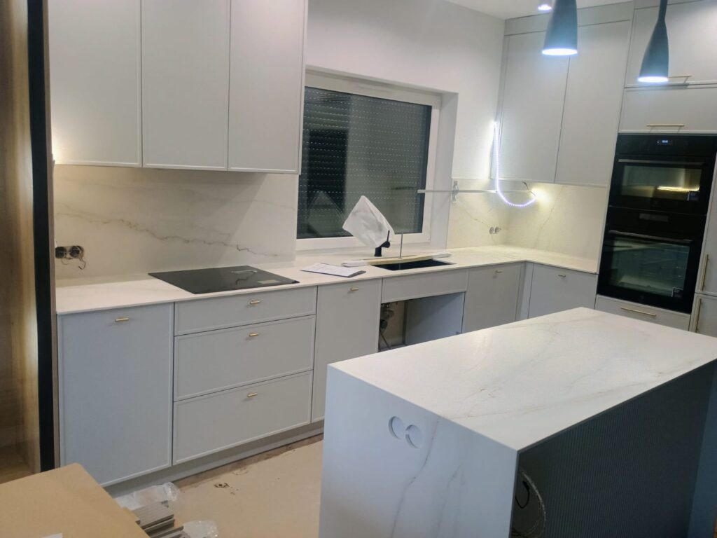 Bei unserem Kunden haben wir elegante Küchenarbeitsplatten aus Laminam Calacatta Lincoln Gold gefertigt und montiert. Dieses Material besticht durch seine edle Marmoroptik mit feiner, goldener Maserung, die dem Raum einen Hauch von Luxus verleiht. Durch präzise Anpassung und sorgfältige Montage entstand ein harmonisches Gesamtbild von moderner Eleganz. Laminam-Platten garantieren Langlebigkeit, Kratz- und Hitzebeständigkeit sowie einfache Pflege – die perfekte Lösung für anspruchsvolle Kunden, die Wert auf Design und Funktionalität legen.