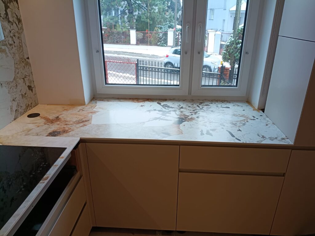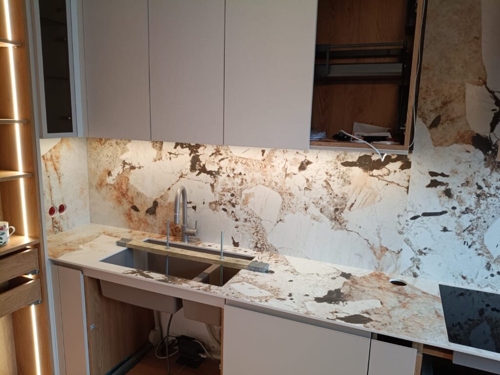 Für unseren Kunden haben wir die fachgerechte Montage von Küchenarbeitsplatten sowie Wandverkleidungen aus dem exklusiven Material Laminam Marmo Patagonia Bianco Extra durchgeführt. Dieser hochwertige Keramikverbundstoff, inspiriert von der einzigartigen Struktur natürlichen Gesteins, verleiht der Küche eine moderne, elegante und äußerst charakteristische Optik. Laminam zeichnet sich nicht nur durch seine exklusive Optik aus, sondern auch durch seine hervorragenden technischen Eigenschaften – darunter Kratzfestigkeit, Hitzebeständigkeit und chemische Resistenz. Dadurch eignet sich das Material ideal für anspruchsvolle Küchenbereiche.