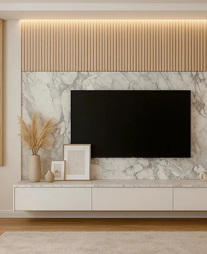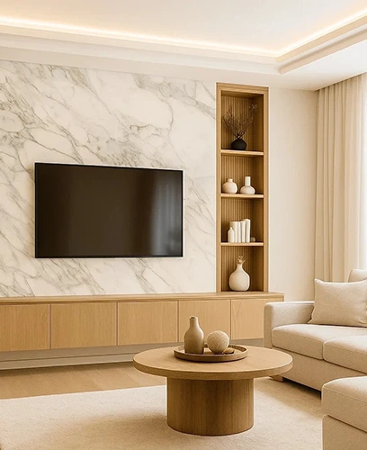 TV-Wände aus Keramik sind ein ausdrucksstarkes Gestaltungselement moderner Wohnräume. Großformatige Keramikplatten schaffen ruhige, elegante Flächen und setzen die TV-Zone stilvoll in Szene. In Kombination mit Holz, integrierter Beleuchtung und maßgefertigten Möbeln entsteht ein harmonisches, hochwertiges Gesamtbild.