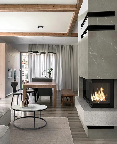 Keramik eröffnet im Wohnbereich völlig neue Gestaltungsmöglichkeiten. Sie eignet sich ideal für Tische, TV-Wände, dekorative Wandpaneele, Kamine oder Treppen und verbindet außergewöhnliche Ästhetik mit höchster Funktionalität. Dank ihrer Kratzfestigkeit, Hitzebeständigkeit und Alltagstauglichkeit ist sie perfekt für Räume geeignet, die intensiv genutzt werden.