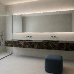 Das Badezimmer Ihrer Träume ist nicht nur eine schöne Waschtischplatte, sondern auch Wand- und Bodenverkleidungen aus großformatigen Keramikplatten oder Naturstein. Der Einsatz von großformatigen Keramikplatten sorgt dafür, dass das Bad nahezu fugenlos und sehr pflegeleicht ist. Besonders schön wirken die Keramikplatten im Bereich der Dusche und der Badewanne. In der Dusche plant man häufig Nischen oder kleine Ablagen für Kosmetikprodukte. Das gesamte Badezimmer sieht einfach fantastisch aus.