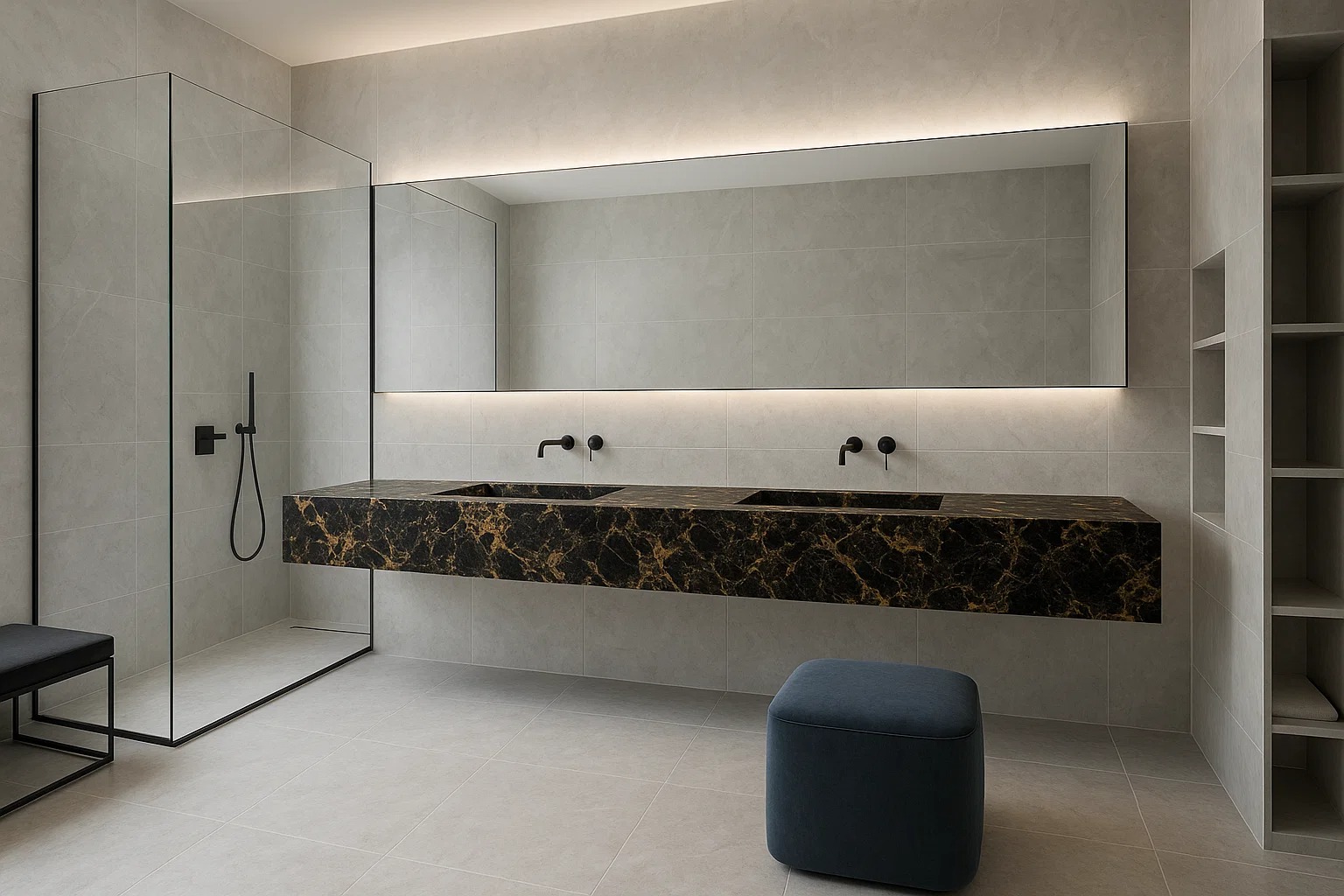 Doppel-Waschtisch nach Maß mit integriertem Waschbecken mit Ablage aus Keramik Naturstein Feinsteinzeug Franko Waterstone Aureline