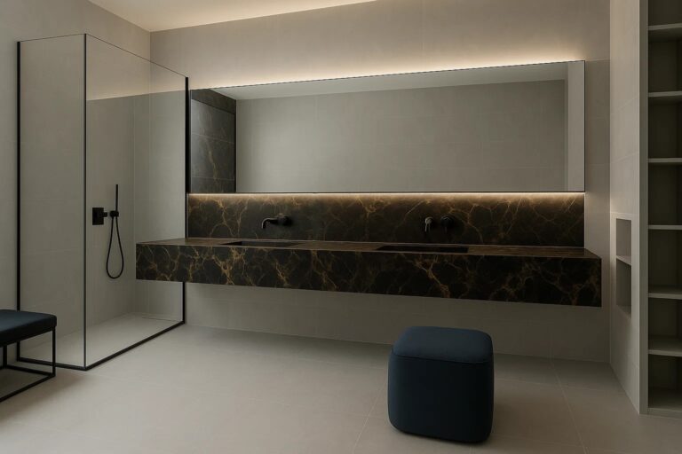 Das Badezimmer Ihrer Träume ist nicht nur eine schöne Waschtischplatte, sondern auch Wand- und Bodenverkleidungen aus großformatigen Keramikplatten oder Naturstein. Der Einsatz von großformatigen Keramikplatten sorgt dafür, dass das Bad nahezu fugenlos und sehr pflegeleicht ist. Besonders schön wirken die Keramikplatten im Bereich der Dusche und der Badewanne. In der Dusche plant man häufig Nischen oder kleine Ablagen für Kosmetikprodukte. Das gesamte Badezimmer sieht einfach fantastisch aus.