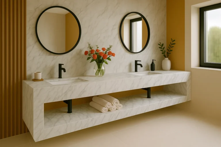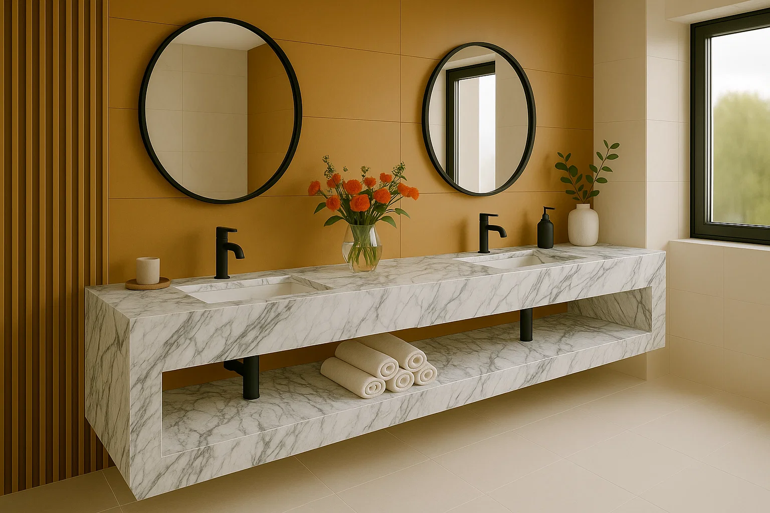 Doppel-Waschtisch nach Maß mit integriertem Waschbecken mit Ablage aus Keramik Naturstein Feinsteinzeug Franko Waterstone Elvoria