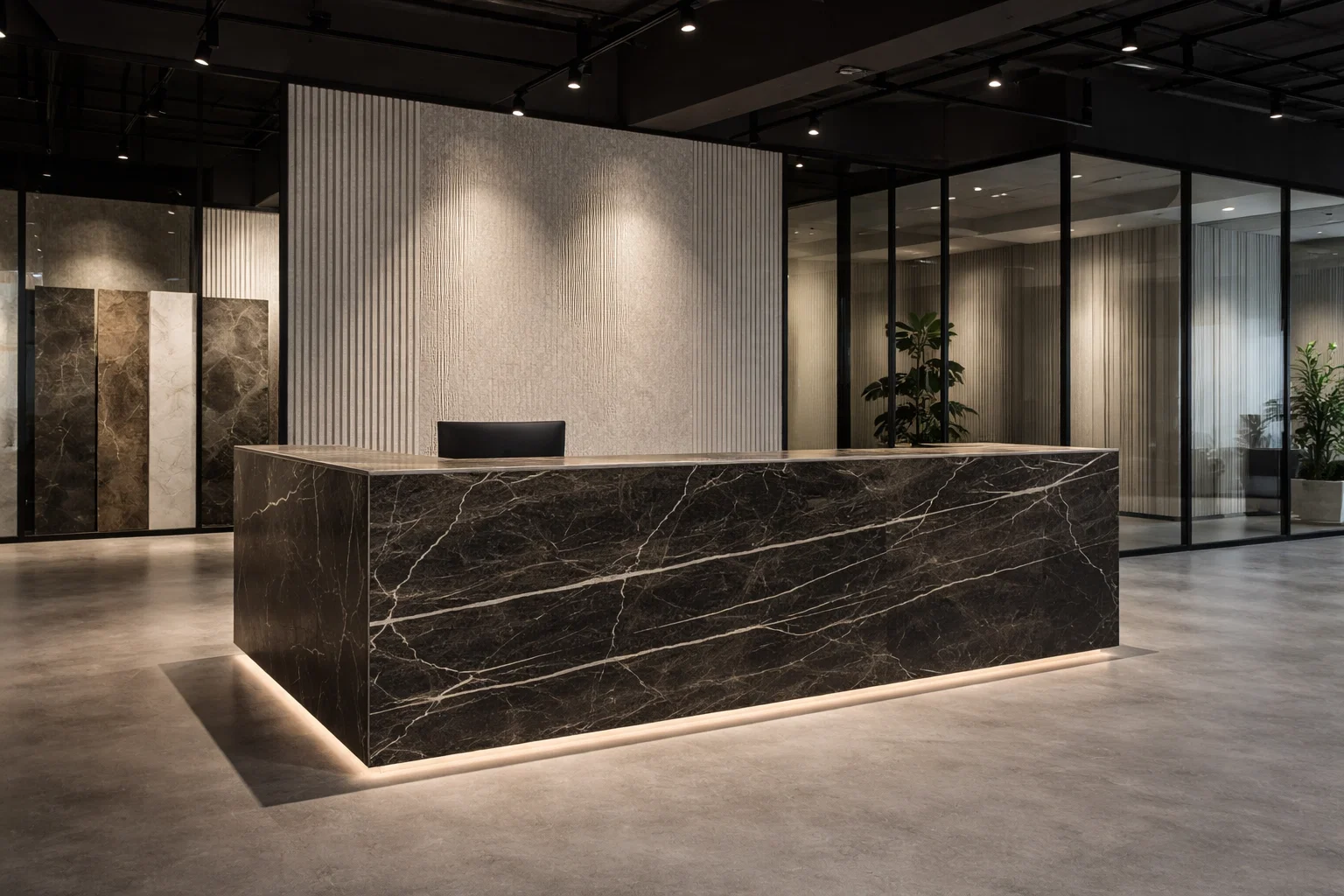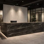 Großformatige Keramikplatten zeichnen sich durch zahlreiche hervorragende Eigenschaften aus, dank derer Ihre Empfangstheke aus Franko-Keramik nicht nur langlebig, sondern auch dauerhaft eindrucksvoll bleibt.