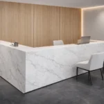 Großformatige Keramikplatten zeichnen sich durch zahlreiche hervorragende Eigenschaften aus, dank derer Ihre Empfangstheke aus Franko-Keramik nicht nur langlebig, sondern auch dauerhaft eindrucksvoll bleibt.
