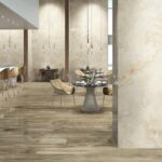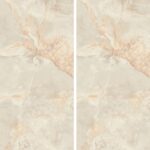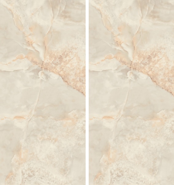 AB Aral Cream-Großkeramikplatten ist mit „Book Match“-Effekt erhältlich. Dabei werden nebeneinanderliegende Paneele so zusammengesetzt, dass ihre Muster ein Spiegelbild ergeben (ähnlich einem offenen Buch). Dadurch entsteht ein Eindruck von Kontinuität, Ordnung und Symmetrie und der Innenraum gewinnt an Harmonie und Eleganz.