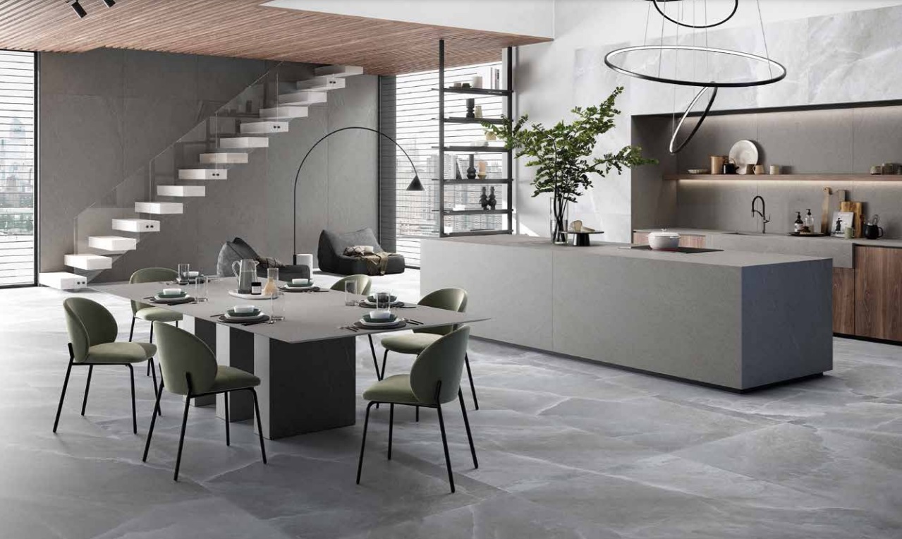 Wir empfehlen Rondine Himalaya Grey Großkeramikplatten für Küchenwandverkleidungen (Küchenschürze), Badezimmer, Flur, Wohnzimmer und jede andere Innenwandverkleidung. Dieses gesinterte Muster ist auch eine großartige Option für Fußböden, Fassaden, Zäune und auch zum Abdecken des gesamten Kamins.