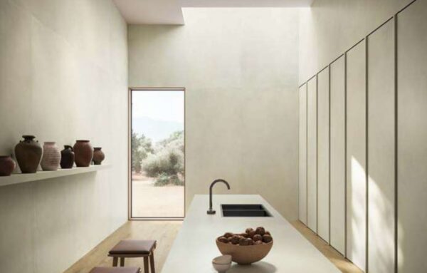 Für eine funktionale Arbeitsplatte in der Küche oder im Badezimmer empfehlen wir Franko Almeria Sand Großkeramikplatten. Es eignet sich perfekt für TV-Wände und Kamininstallationen. Aus dem Sinterstein Franko Almeria Sand können wir Wandverkleidungen (Schürzen), Fensterbänke und Treppenverkleidungen außen und innen herstellen. Wir bieten auch ein Waschbecken und ein Spülbecken aus gesintertem Franko-Stein an, die in die Arbeitsplatte integriert sind – das Ganze ergibt einen schönen Monolith-Effekt. Dieses gesinterte Muster ist eine großartige Option für Fassaden, Zäune und Fensternischen.