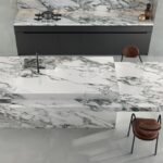 Für eine funktionale Küchen– oder Badezimmer-Arbeitsplatte empfehlen wir den Großkeramikplatten Franko Arabescato Magnifico. Es eignet sich perfekt für TV-Wände und Kamininstallationen. Aus dem Sinterstein Franko Arabescato Magnifico können wir Wandverkleidungen (Schürzen), Fensterbänke und Treppenverkleidungen außen und innen herstellen. Wir bieten auch ein Waschbecken und ein Spülbecken aus gesintertem Franko-Stein an, die in die Arbeitsplatte integriert sind – das Ganze ergibt einen schönen Monolith-Effekt. Dieses gesinterte Muster ist eine großartige Option für Fassaden, Zäune und Fensternischen.