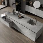 Für eine funktionale Arbeitsplatte in der Küche oder im Badezimmer empfehlen wir den Großkeramikplatten Franko Pietra Light Grey. Es eignet sich perfekt für TV-Wände und Kamininstallationen. Aus dem Sinterstein Franko Pietra Light Grey können wir Wandverkleidungen (Schürzen), Fensterbänke und Treppenverkleidungen außen und innen herstellen. Wir bieten auch ein Waschbecken und ein Spülbecken aus gesintertem Franko-Stein an, die in die Arbeitsplatte integriert sind – das Ganze ergibt einen schönen Monolith-Effekt. Dieses gesinterte Muster ist eine großartige Option für Fassaden, Zäune und Fensternischen.