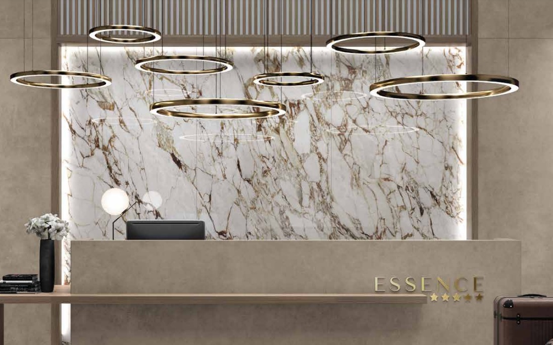 Der Mirage Cosmopolitan CP03 Großkeramikplatten zeichnet sich durch seinen „Book Match“-Effekt aus. Dabei werden nebeneinander liegende Paneele so angebracht, dass ihre Muster ein Spiegelbild ergeben und an ein offenes Buch erinnern. Dadurch entsteht beim Kunden ein Eindruck von Kontinuität, Ordnung und Symmetrie und der Innenraum gewinnt an Harmonie und Eleganz.