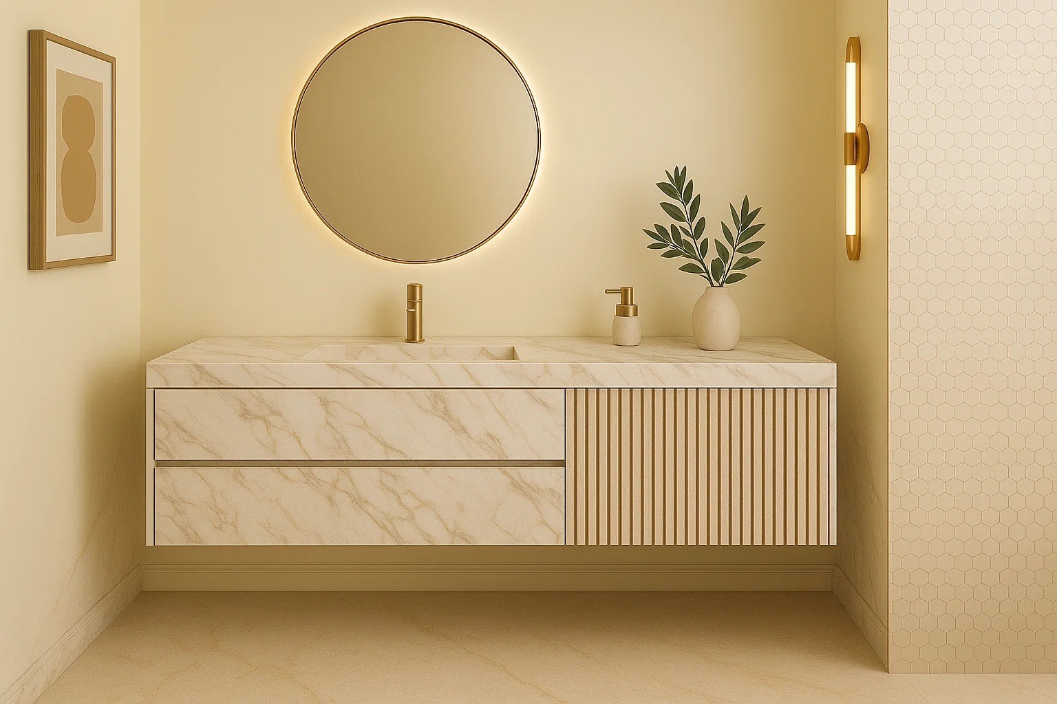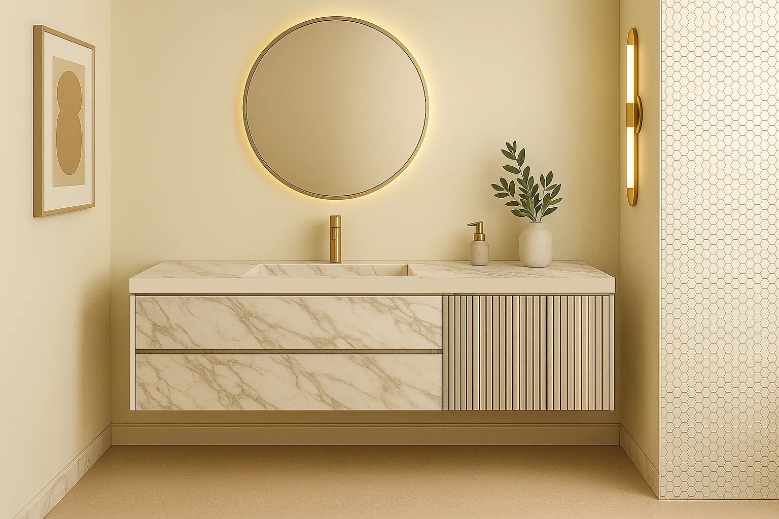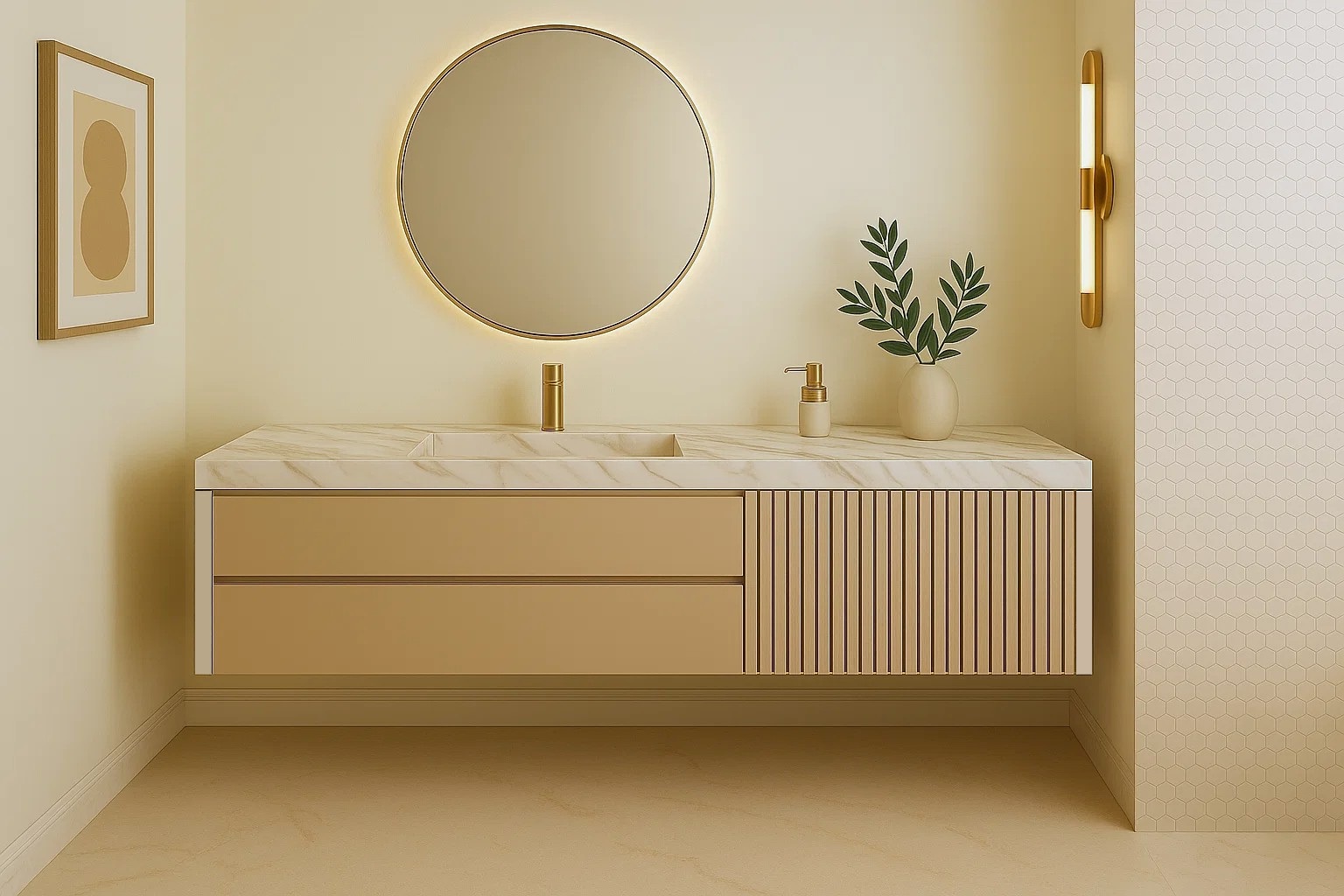 Holzunterschrank mit verstärkter Keramik-Waschtischplatte und seitlichen Paneelen
