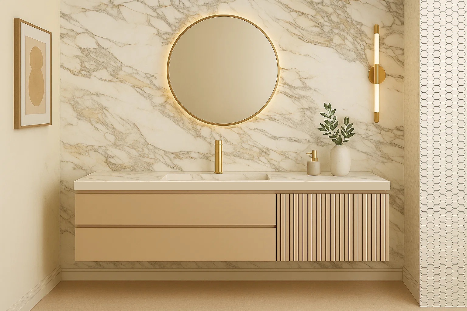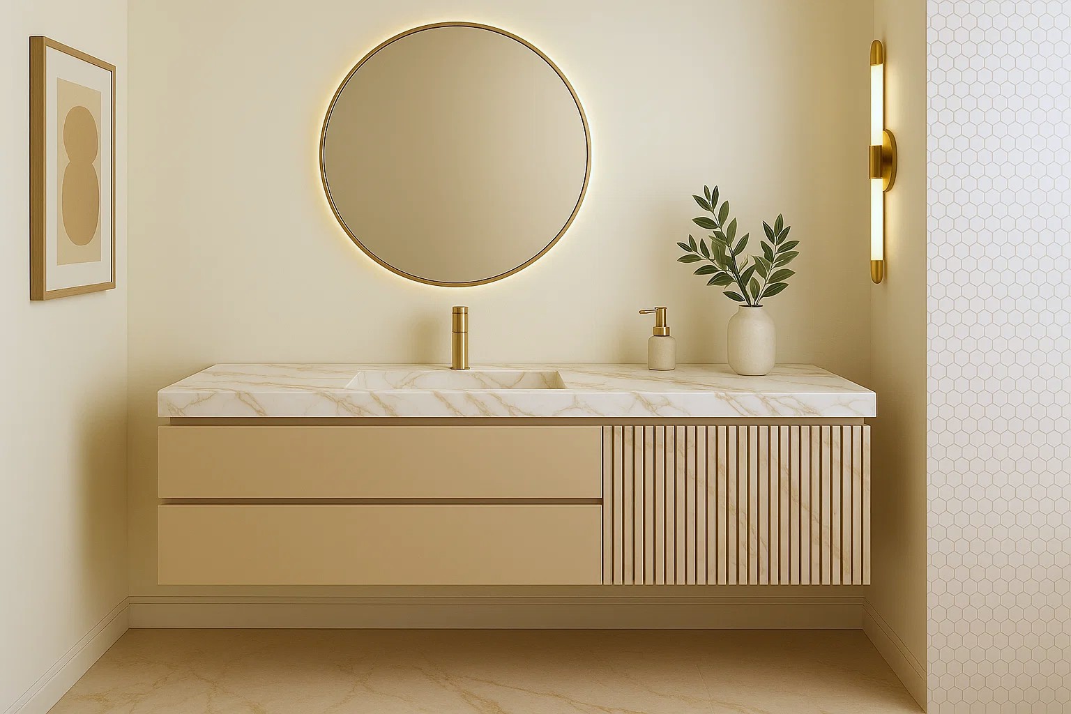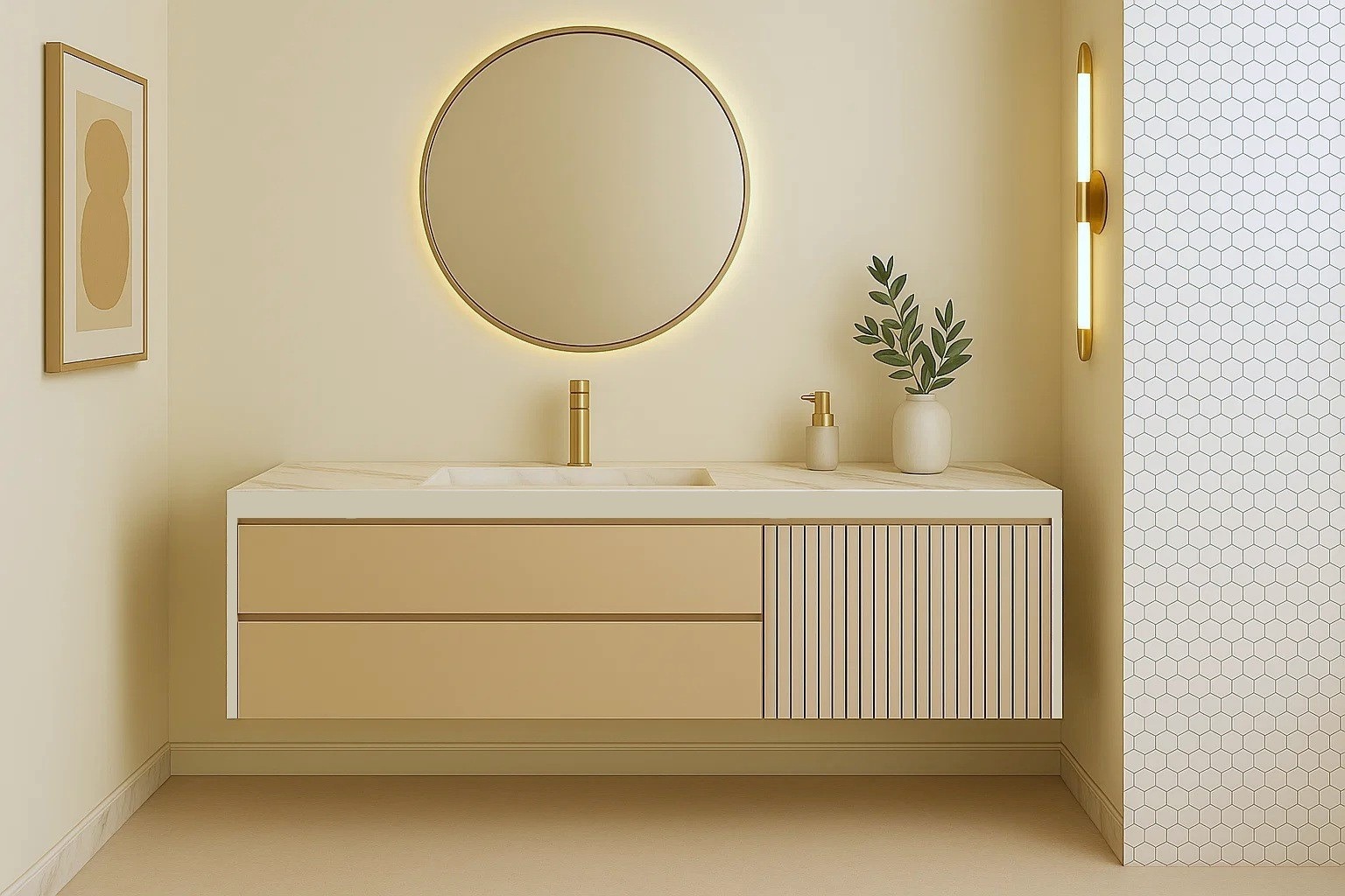 Holzunterschrank mit verstärkter Keramik-Waschtischplatte und seitlichen Paneelen