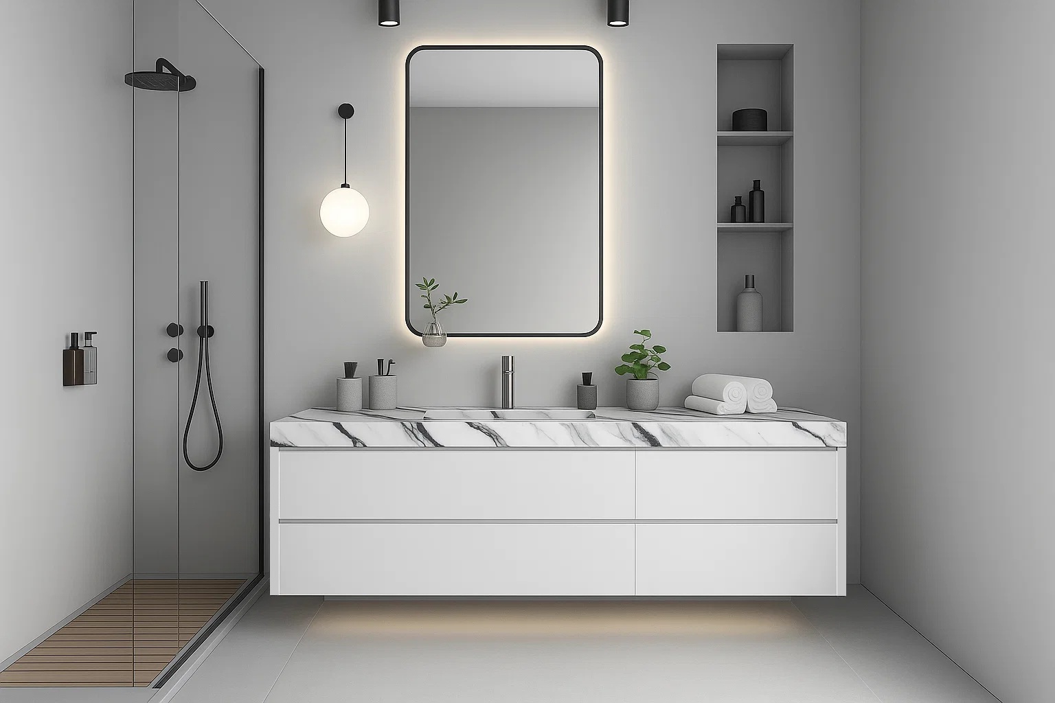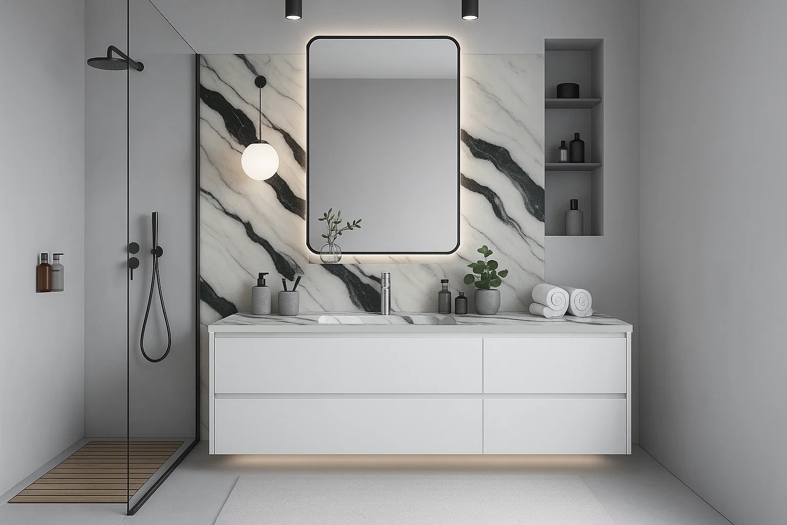 Der Bereich rund um den Waschtisch ist im Badezimmer besonders beansprucht und anfällig für Verschmutzungen. Auf Wunsch ergänzen wir Ihre Waschtischkombination um eine passgenaue Rückwand (Spritzschutz) aus großformatiger Keramikplatte.