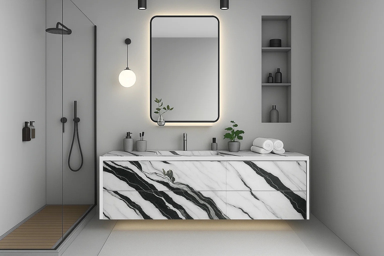 Der Preis der Waschtischkombination basiert auf einem frei wählbaren Dekor aus der Franko-Kollektion. Keramikplatten der Marken Neolith, Laminam, Dekton, Florim oder Silestone sind gegen Aufpreis erhältlich.