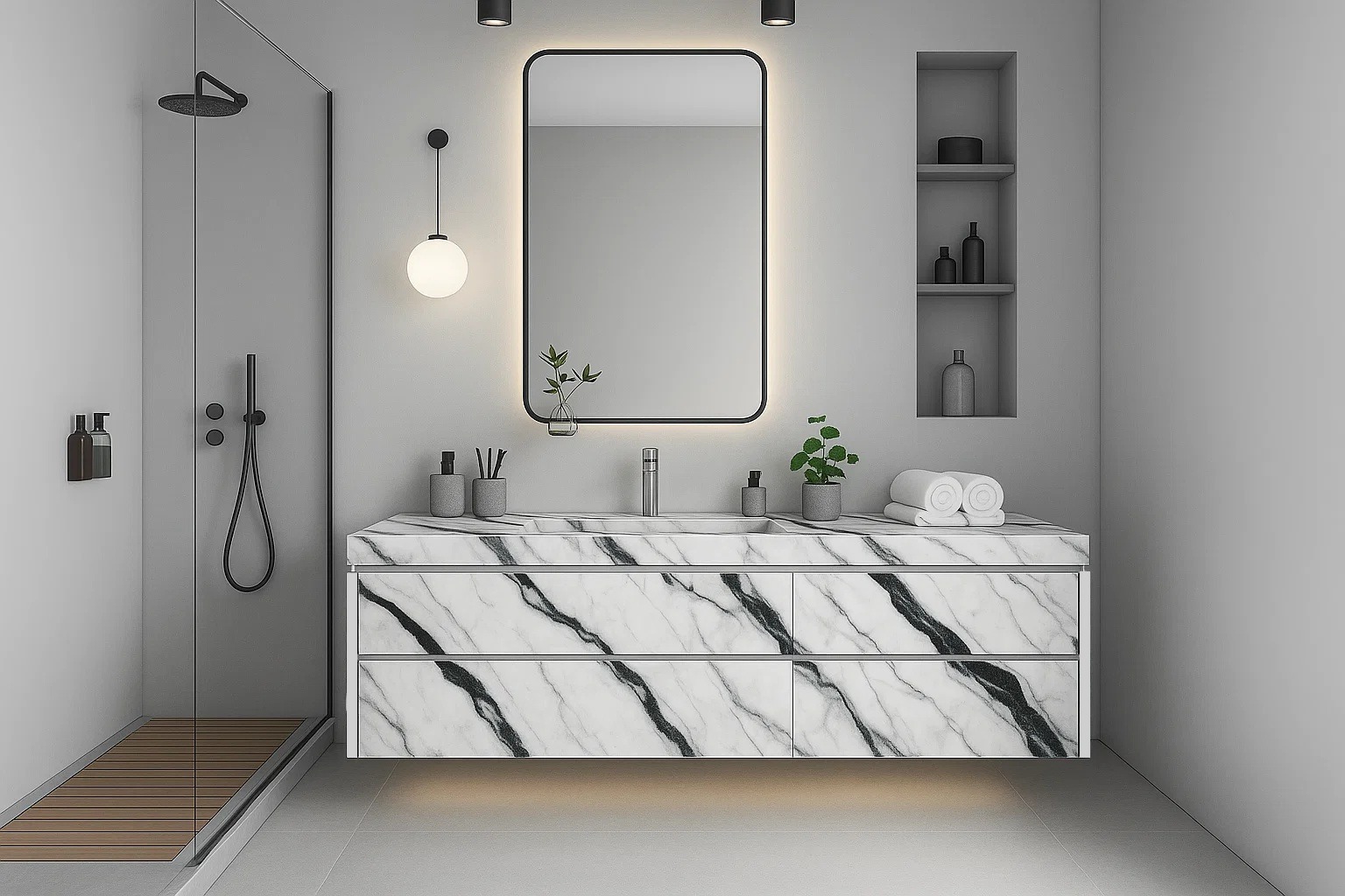 Holzunterschrank mit verstärkter Keramik-Waschtischplatte und seitlichen Paneelen