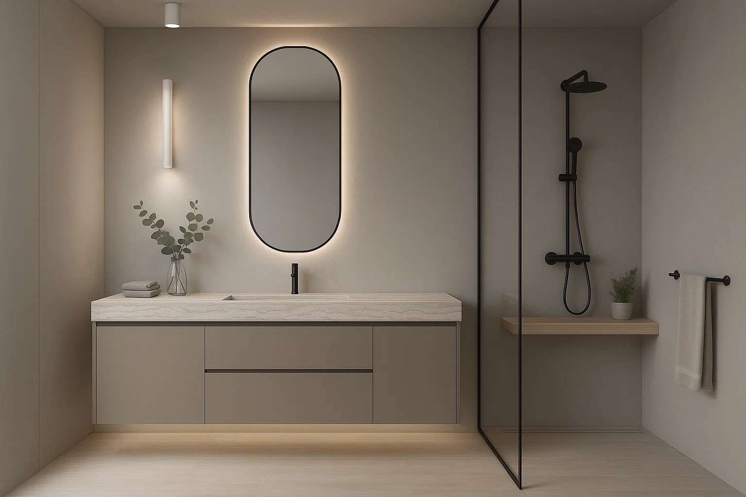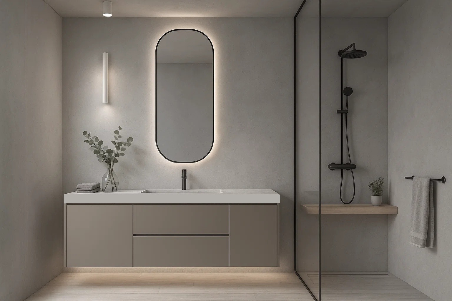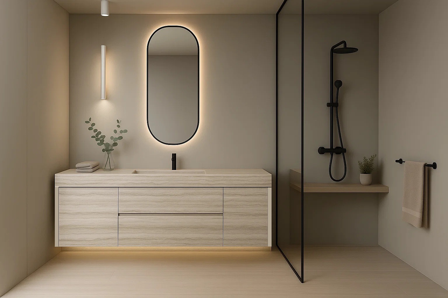 Das Badezimmer Ihrer Träume besteht aus mehr als nur einer hochwertigen Waschtischlösung. Großformatige Keramikplatten oder Naturstein an Wänden und Böden schaffen ein harmonisches, modernes Gesamtbild und verleihen dem Raum eine besondere Eleganz. Durch den Einsatz großformatiger Platten entsteht nahezu eine fugenlose Oberfläche, die nicht nur optisch überzeugt, sondern auch besonders pflegeleicht ist.