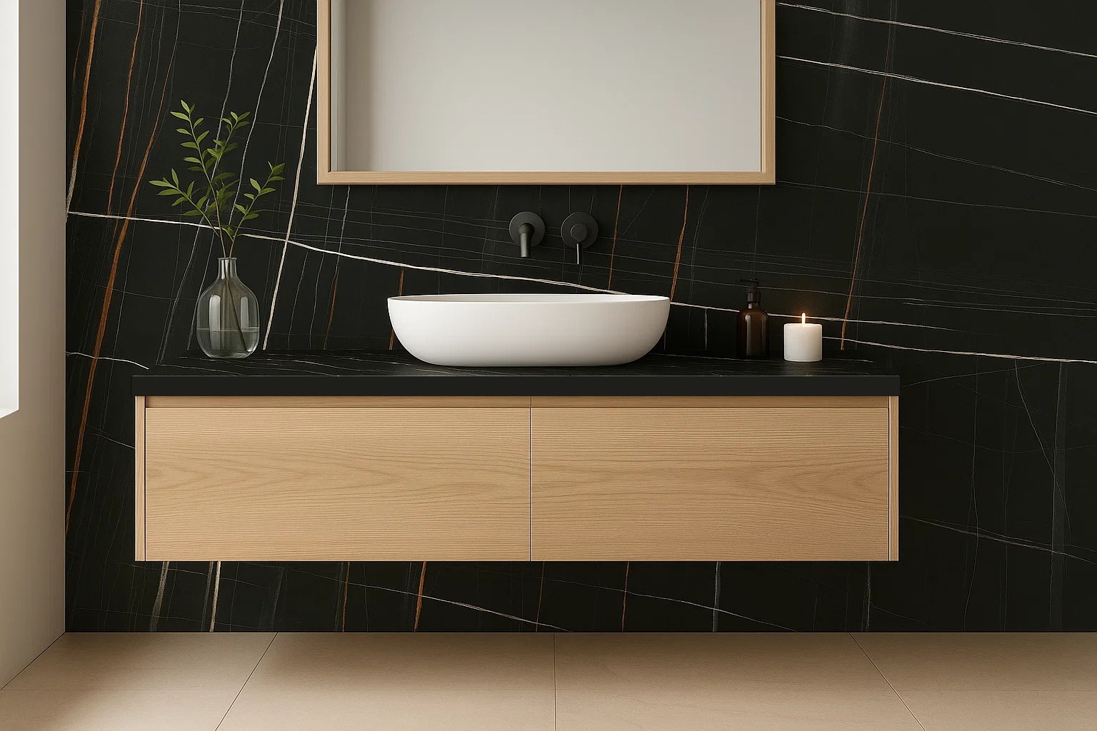 Der Bereich rund um den Waschtisch ist im Badezimmer besonders beansprucht und anfällig für Verschmutzungen. Auf Wunsch ergänzen wir Ihre Waschtischkombination um eine passgenaue Rückwand (Spritzschutz) aus großformatiger Keramikplatte.