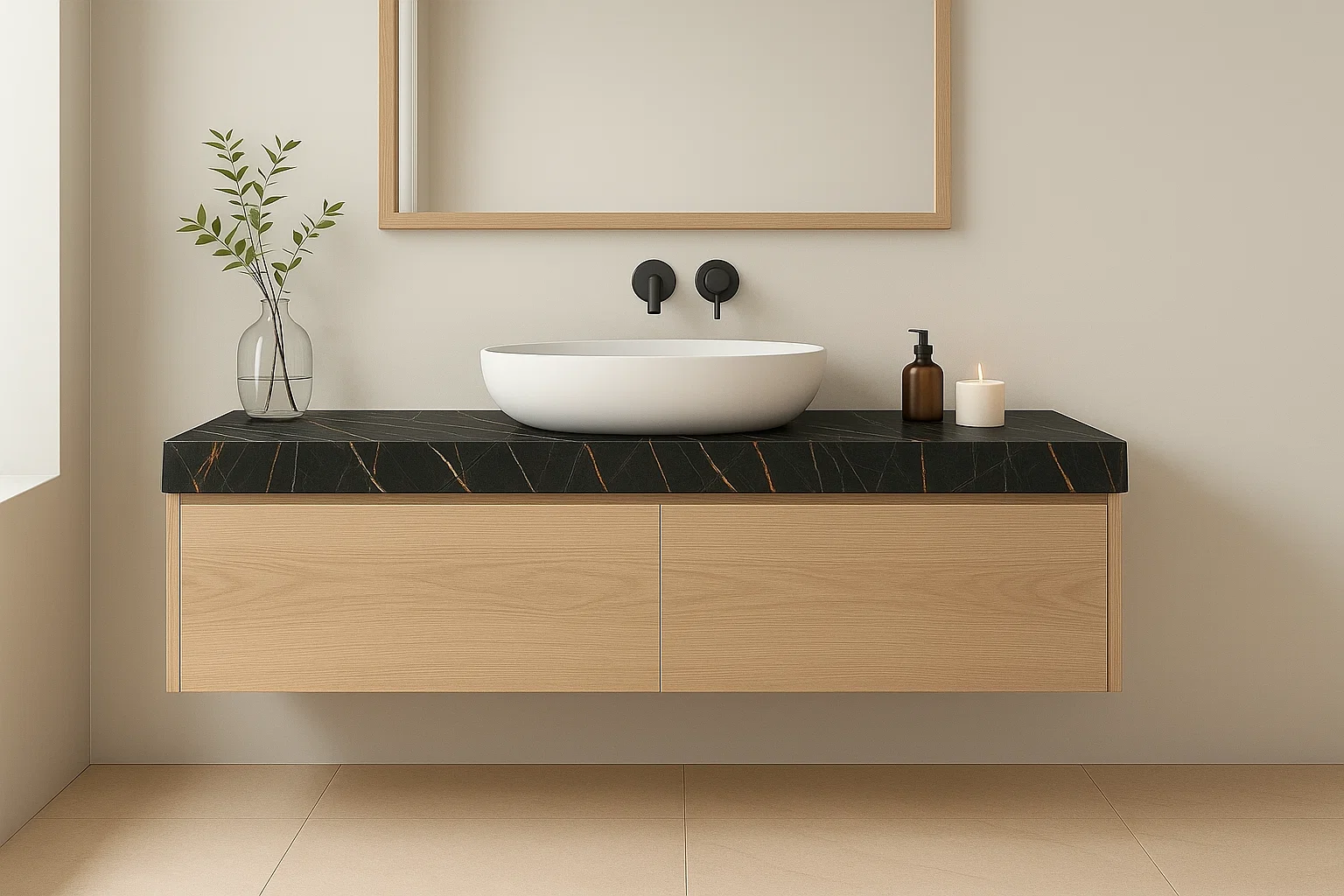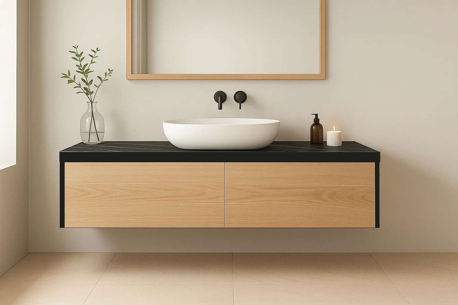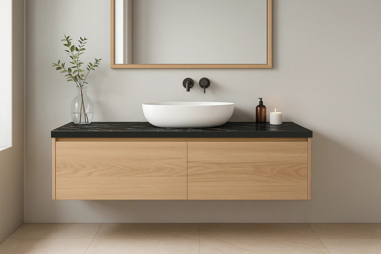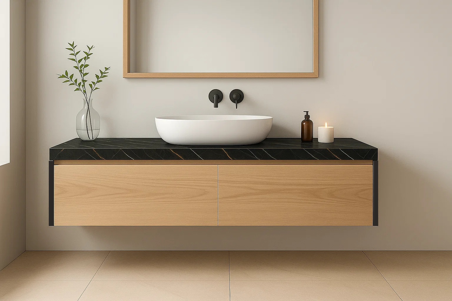Holzunterschrank mit verstärkter Keramik-Waschtischplatte und seitlichen Paneelen