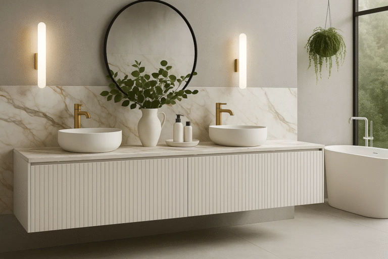 Das Badezimmer Ihrer Träume ist nicht nur eine schöne Waschtischplatte, sondern auch Wand- und Bodenverkleidungen aus großformatigen Keramikplatten oder Naturstein. Der Einsatz von großformatigen Keramikplatten sorgt dafür, dass das Bad nahezu fugenlos und sehr pflegeleicht ist. Besonders schön wirken die Keramikplatten im Bereich der Dusche und der Badewanne. In der Dusche plant man häufig Nischen oder kleine Ablagen für Kosmetikprodukte. Das gesamte Badezimmer sieht einfach fantastisch aus.
