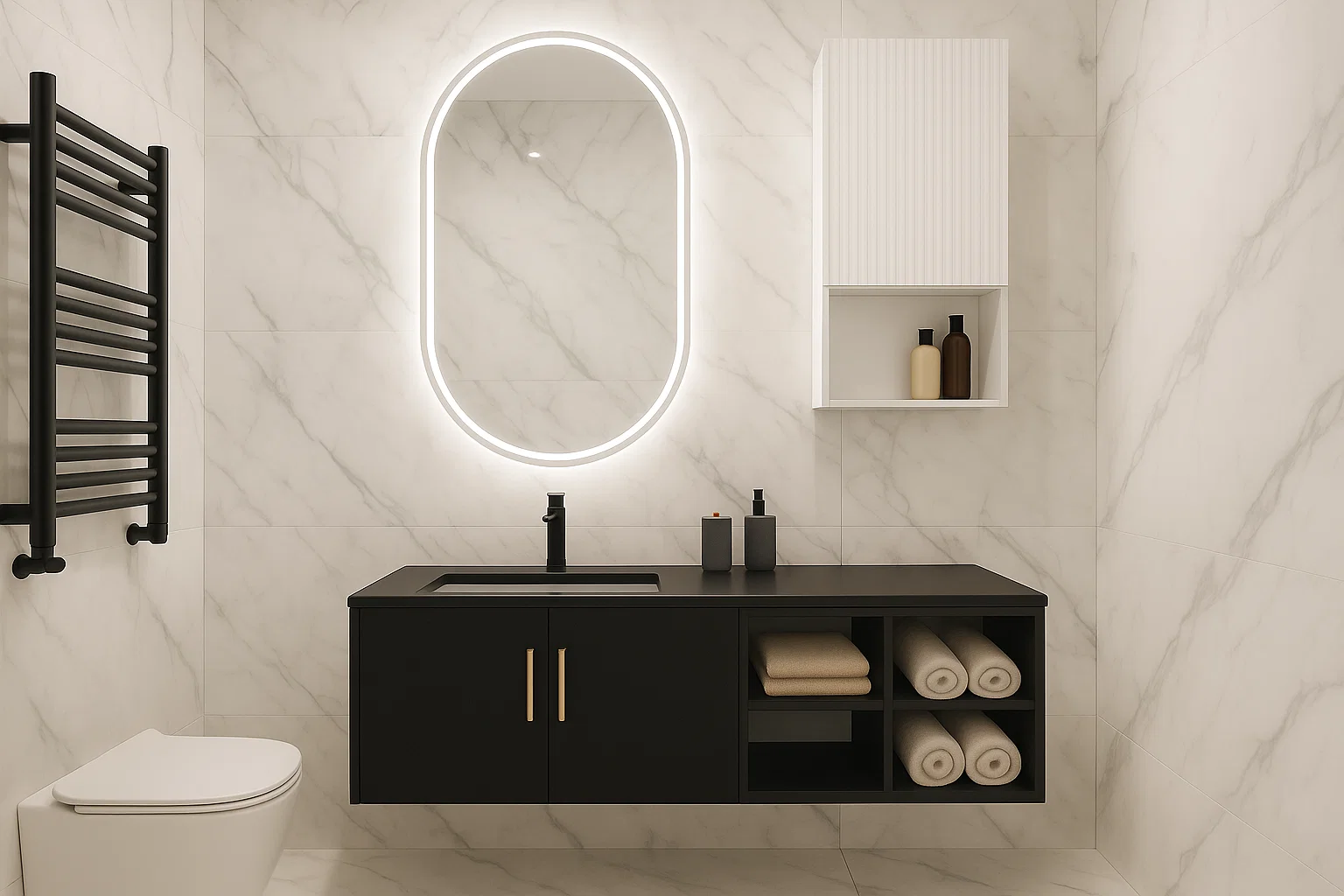 Wir können für Sie auch einen individuellen Badunterschrank entwerfen und anfertigen – mit Fronten und Seitenpanelen aus Keramikplatten, selbstverständlich inklusive einer passenden Waschtischplatte.