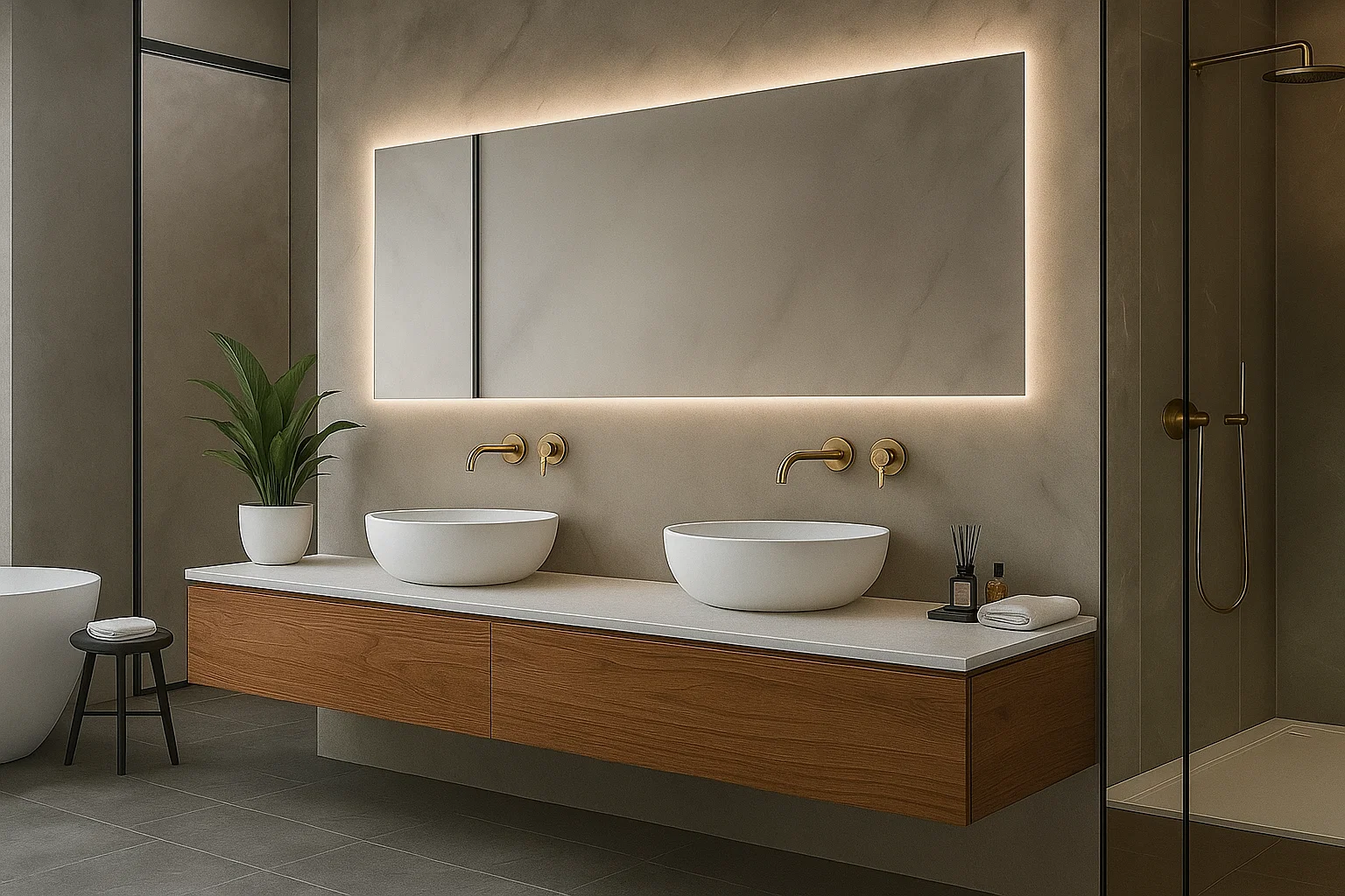 Das Badezimmer Ihrer Träume ist nicht nur eine schöne Waschtischplatte, sondern auch Wand- und Bodenverkleidungen aus großformatigen Keramikplatten oder Naturstein. Der Einsatz von großformatigen Keramikplatten sorgt dafür, dass das Bad nahezu fugenlos und sehr pflegeleicht ist. Besonders schön wirken die Keramikplatten im Bereich der Dusche und der Badewanne. In der Dusche plant man häufig Nischen oder kleine Ablagen für Kosmetikprodukte. Das gesamte Badezimmer sieht einfach fantastisch aus.