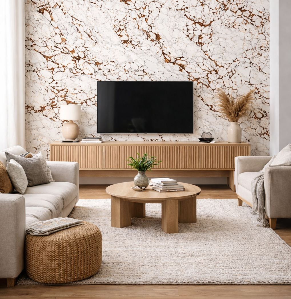 Das markanteste Merkmal des Arabescato Amber ist das warme und ausdrucksstarke Muster mit subtil unregelmäßiger Maserung, das dem Raum eine natürliche Note verleiht.