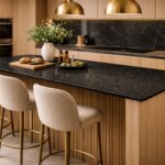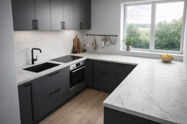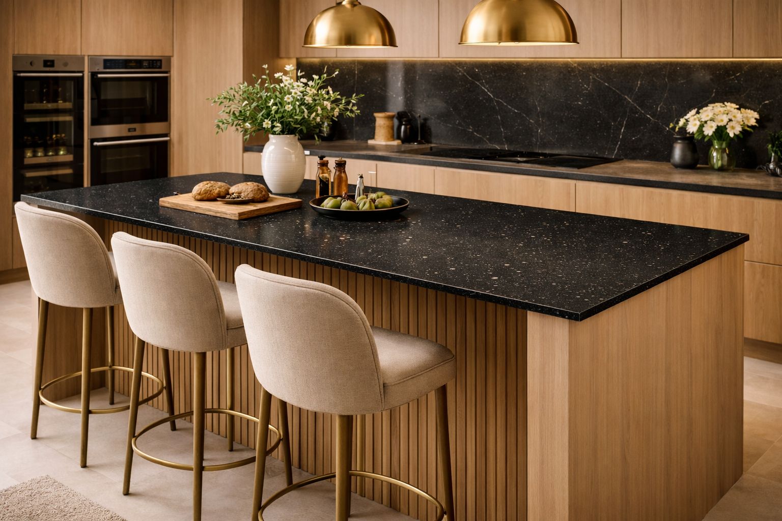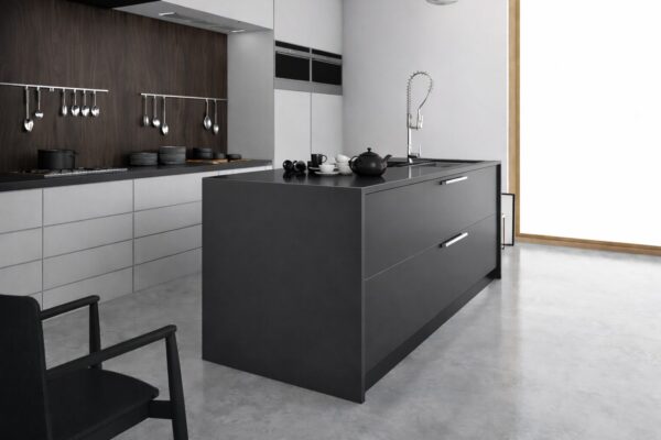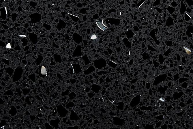 Galaxy aus der F-Quartz Kollektion ist ein modernes Quarz-Konglomerate (Quarzgranit), das minimalistische Ästhetik mit hervorragenden Gebrauchseigenschaften verbindet. Die dunkle, graphitfarbene Basis ist mit feinen, funkelnden Mineralpartikeln durchzogen, die der Oberfläche einen einzigartigen Charakter und zeitlose Eleganz verleihen. So passt das Material sowohl zu modernen als auch zu klassischen Raumgestaltungen.