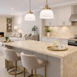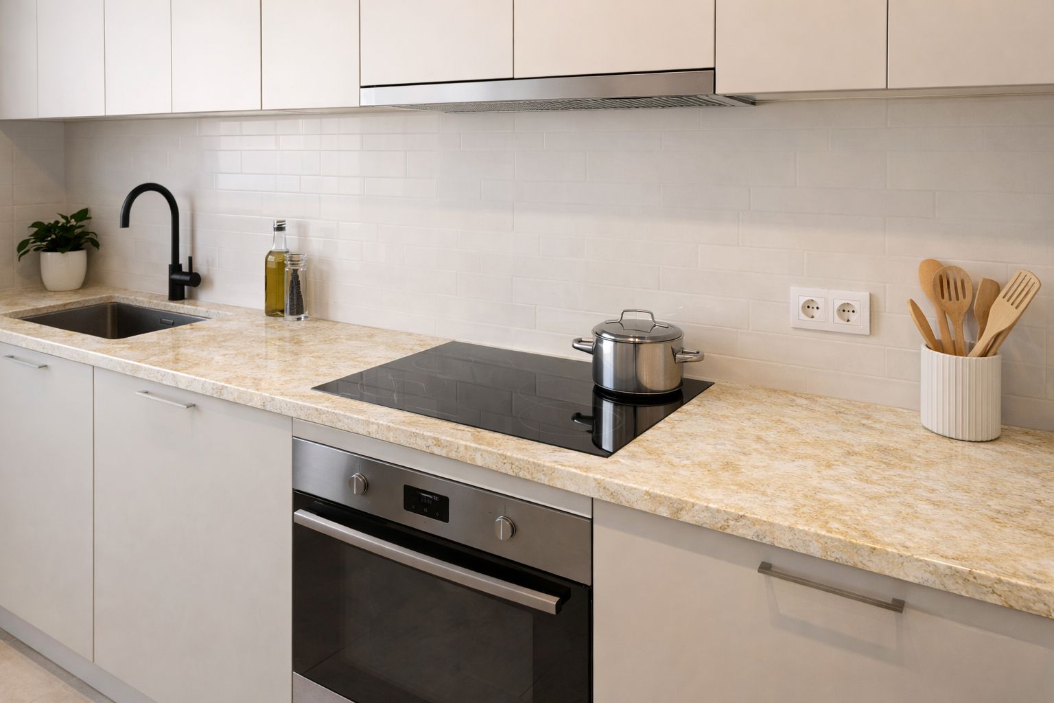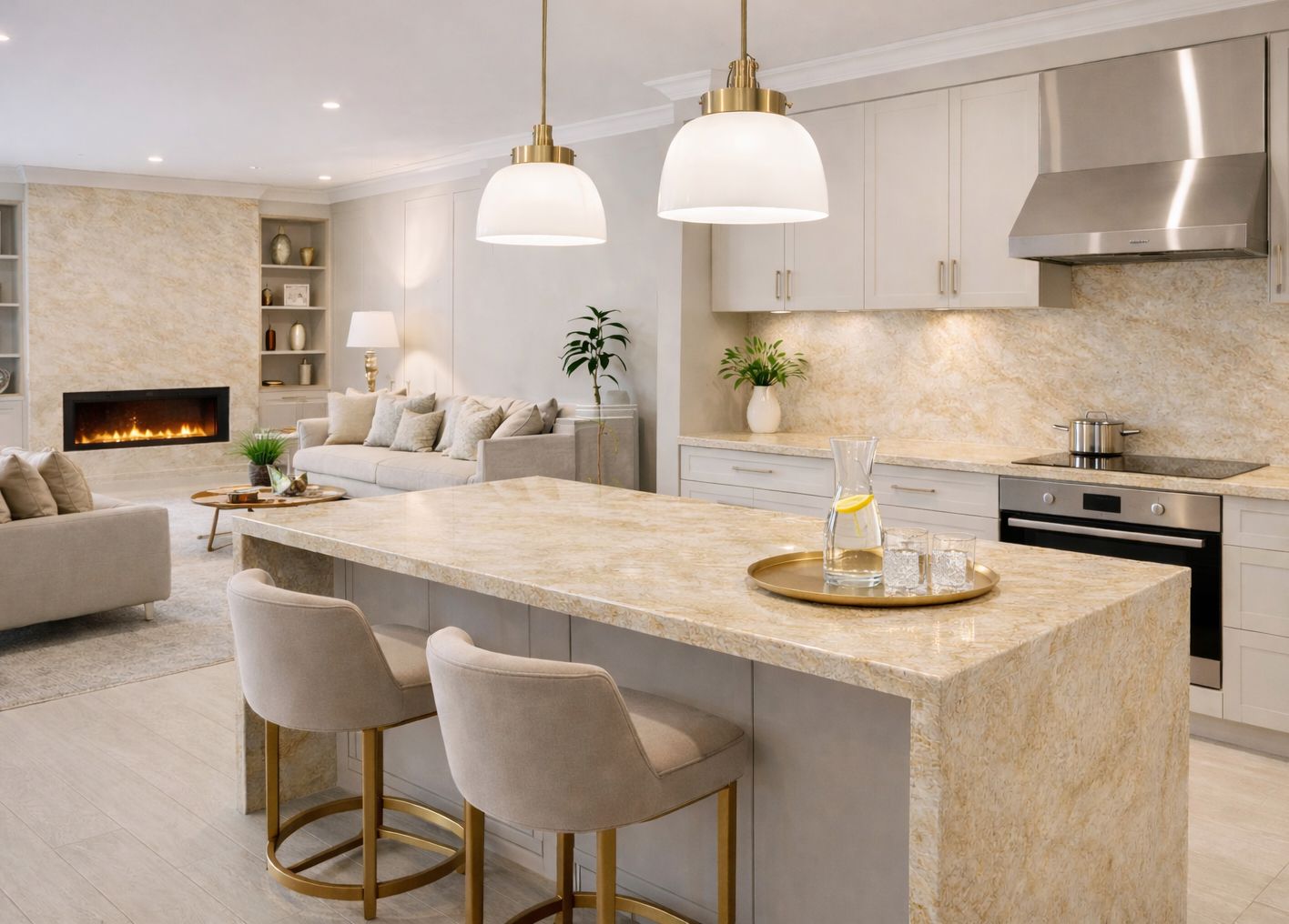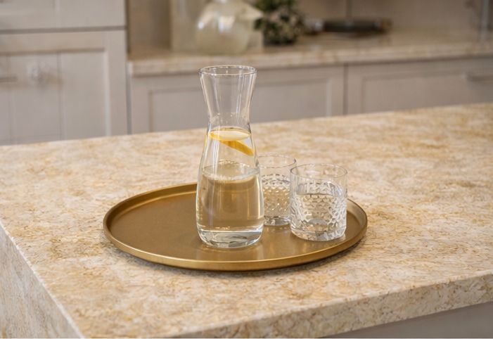 Das markanteste Merkmal des F-Quartz Lumera ist seine Farbgestaltung und das Muster. Auf der Oberfläche verlaufen sanfte, wellenförmige Adern in gold-sandigen Tönen über den hellen Hintergrund. Die Struktur ist weder aggressiv noch kontrastreich – sie bietet ein ruhiges, harmonisches Muster, das der Oberfläche einen eleganten und luxuriösen Charakter verleiht.