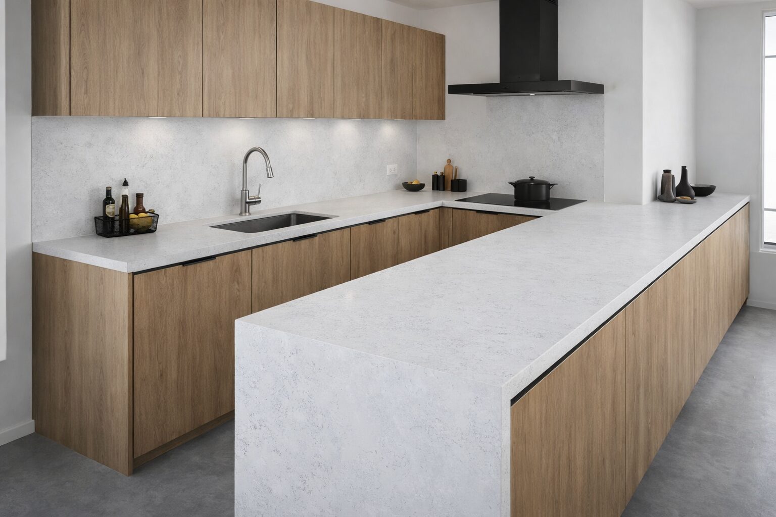 Die polierte Oberfläche vermittelt ein weiches Erscheinungsbild. Sie verleiht dem Material einen dezent matten Effekt. Das Licht wird gleichmäßig gestreut, ohne starken Glanz, was den natürlichen Charakter der Farbe betont und die Arbeitsplatte modern und subtil wirken lässt. Dies ist die ideale Lösung für Räume, in denen ruhige Ästhetik und Eleganz im Vordergrund stehen.