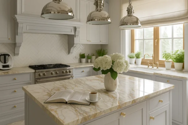 Küchenarbeitsplatte aus Keramik nach Maß, Hellgrau, Weiß – Franko White Gold