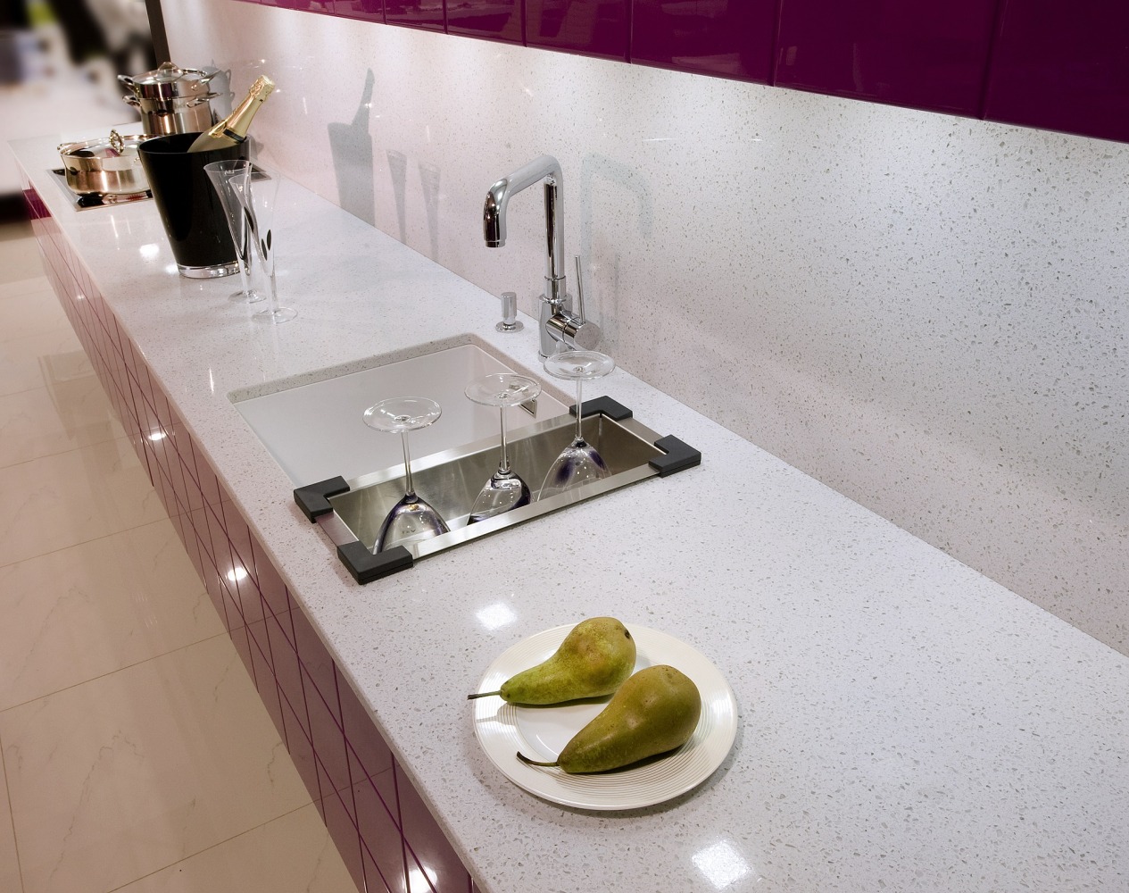 Bei der Bestellung der Keramikarbeitsplatte kann man in Erwägung ziehen, Abtropffrillen oder eine Abtropffläche direkt neben der Spüle zu integrieren. So läuft das Wasser von Geschirr direkt in die Spüle ab.