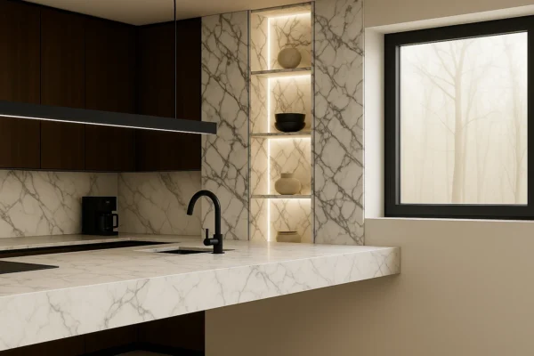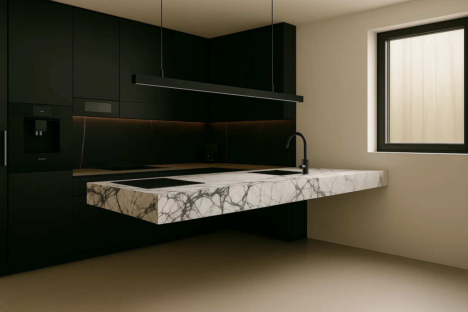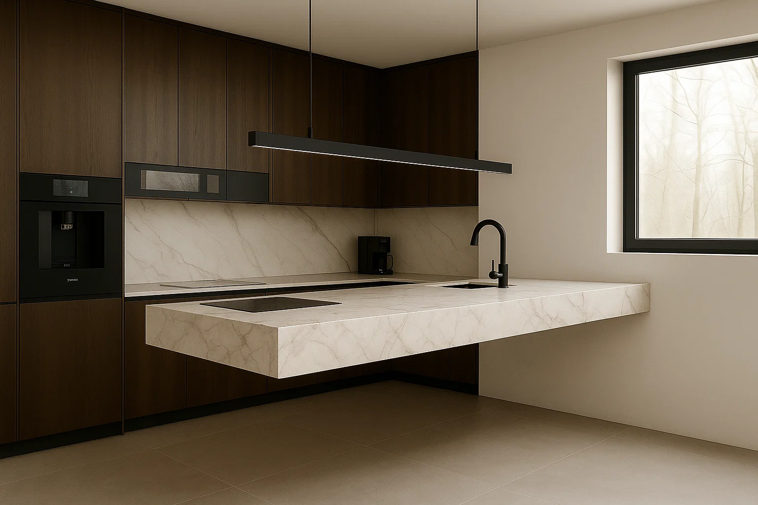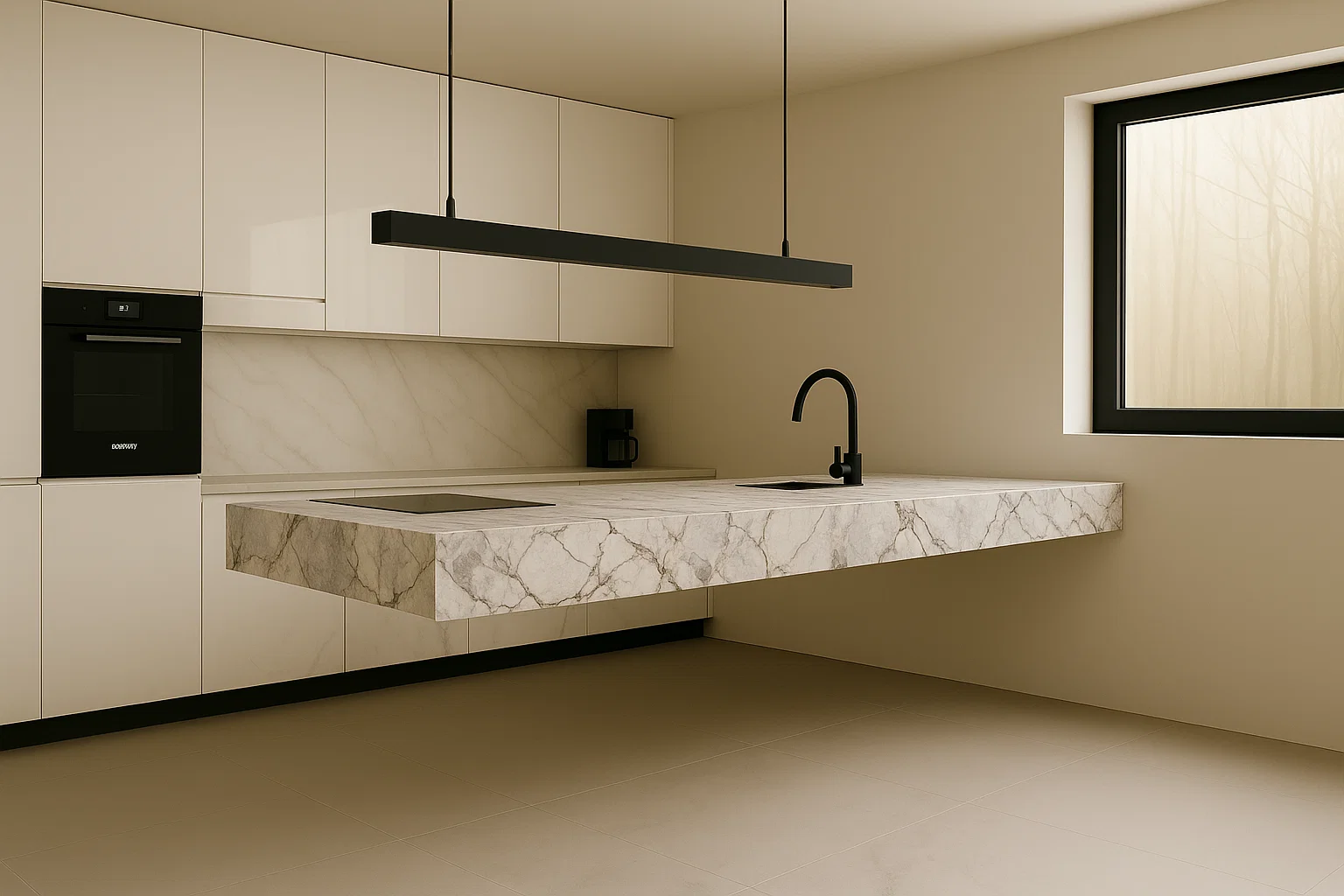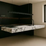 - Arbeitsplatten auf Küchenmöbeln, die perfekt mit der schwebenden Kücheninsel harmonieren,