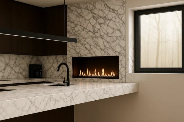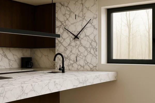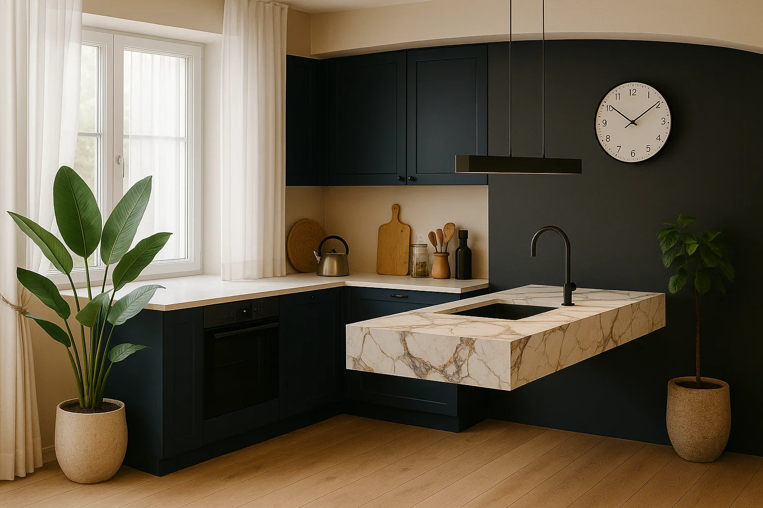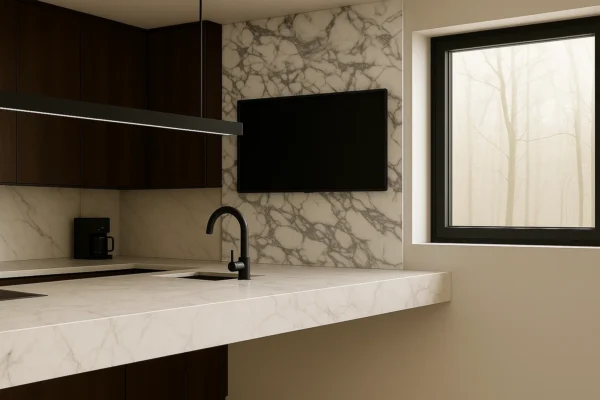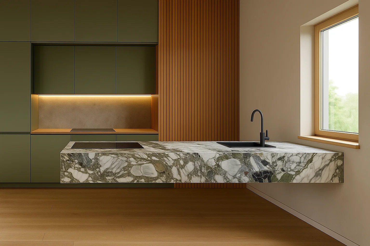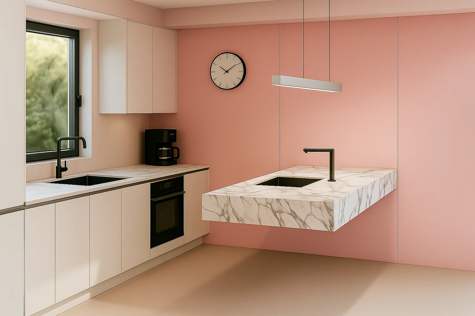 - Arbeitsplatten auf Küchenmöbeln, die perfekt mit der schwebenden Kücheninsel harmonieren,