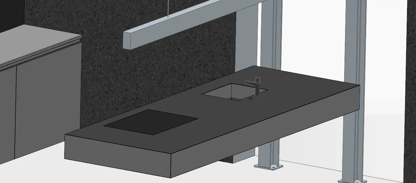 - ein technisches Konstruktionsprojekt inklusive 3D-Visualisierung der schwebenden Küchenarbeitsplatte aus großformatigen Keramikplatten – individuell abgestimmt auf Ihre Küchengeräte wie Kochfeld, Spüle und Steckdosen,