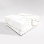 Ein moderner Kaffeetisch in Form eines rechteckigen Monolithen, der vollständig aus Franko Keramik Calacatta Oro Venato besteht. Die Oberfläche des Monolithen ist nicht absorbierend, absolut widerstandsfähig gegen Schmutz, Kratzer und Temperaturschocks. Der Kaffetisch ist UV-beständig. Eine Oberfläche mit lebenslanger Farbechtheit. Der Tisch wurde vollständig in EU hergstellt aus Komponenten hergestellt, die aus EU-Ländern kommen.