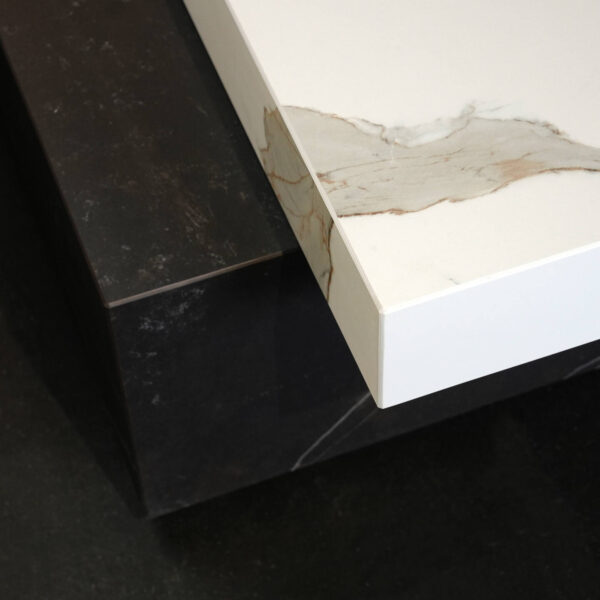 Ein moderner Kaffeetisch in Form eines rechteckigen Monolithen, der vollständig aus Franko Keramik Noir Desir besteht. Die Oberfläche des Monolithen ist nicht absorbierend, absolut widerstandsfähig gegen Schmutz, Kratzer und Temperaturschocks. Der Kaffetisch ist UV-beständig. Eine Oberfläche mit lebenslanger Farbechtheit. Der Tisch wurde vollständig in EU hergstellt aus Komponenten hergestellt, die aus EU-Ländern kommen.