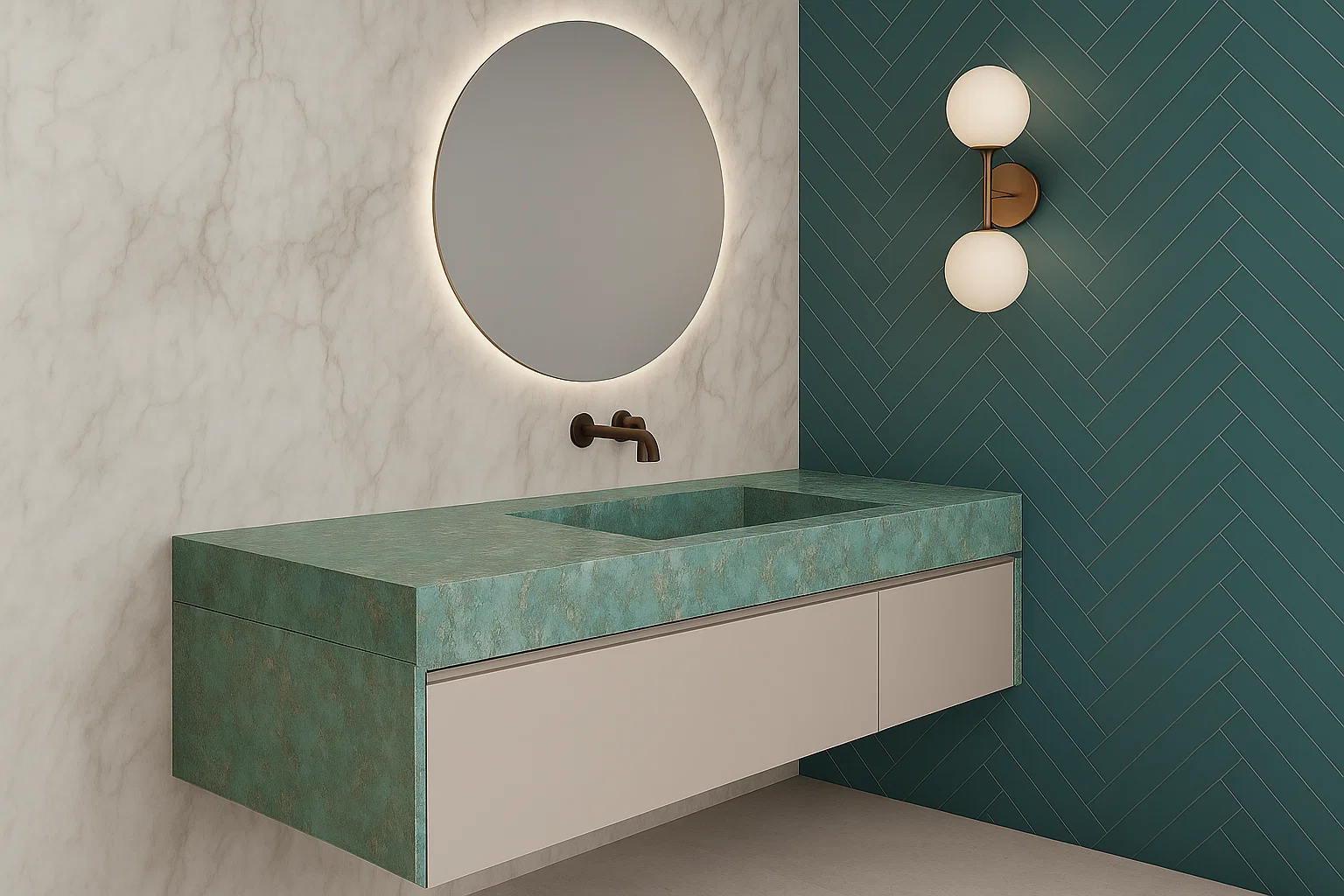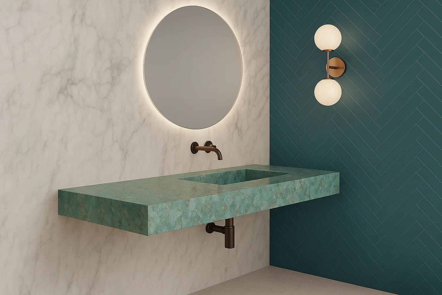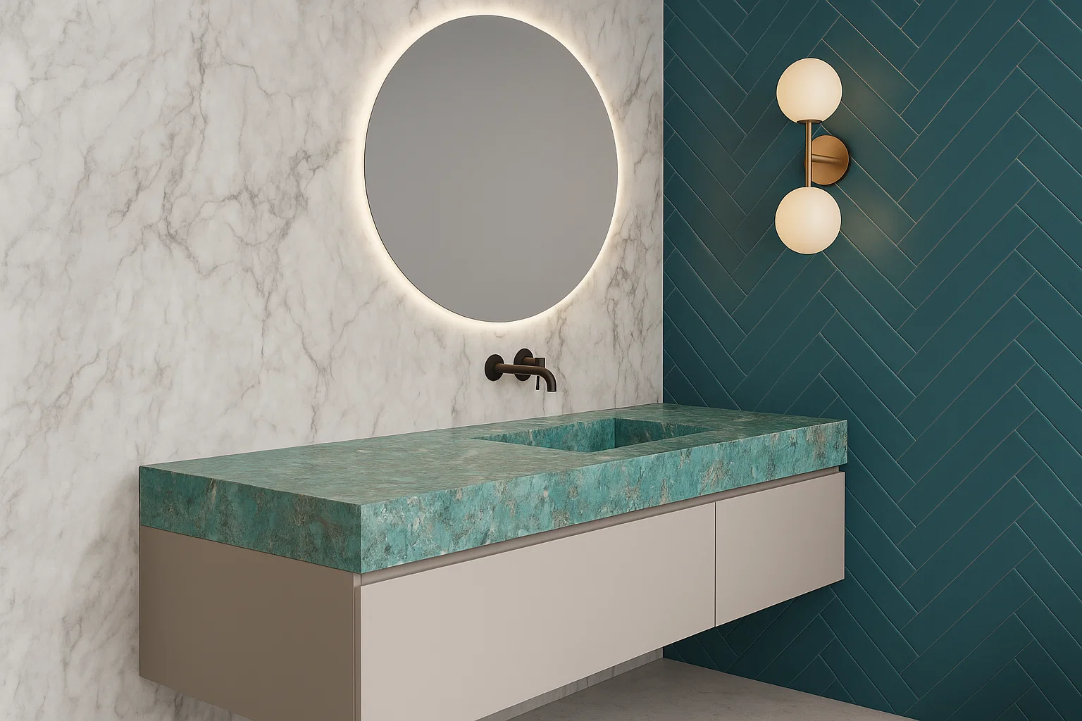 Waschtisch nach Maß mit integriertem Waschbecken aus Keramik, Feinsteinzeug, Naturstein – Franko Waterstone Slikini