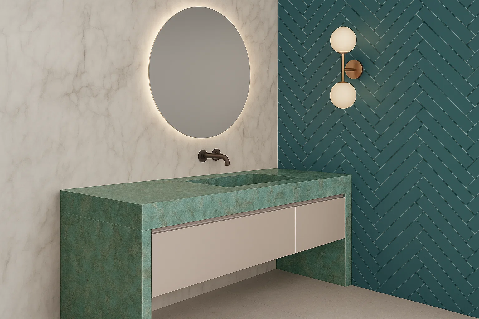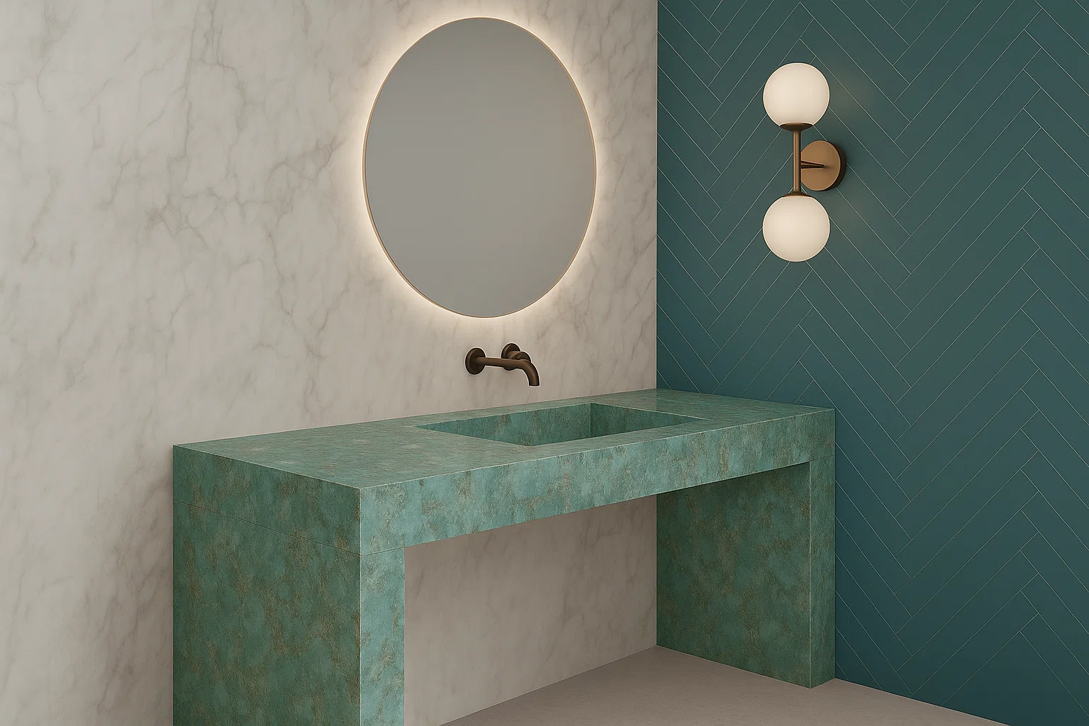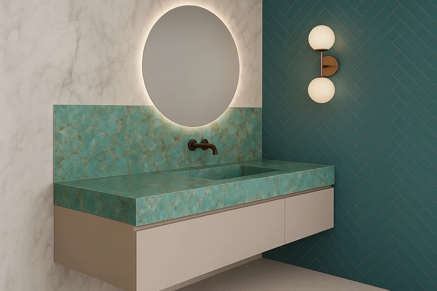 Waschtisch nach Maß mit integriertem Waschbecken aus Keramik, Feinsteinzeug, Naturstein – Franko Waterstone Slikini