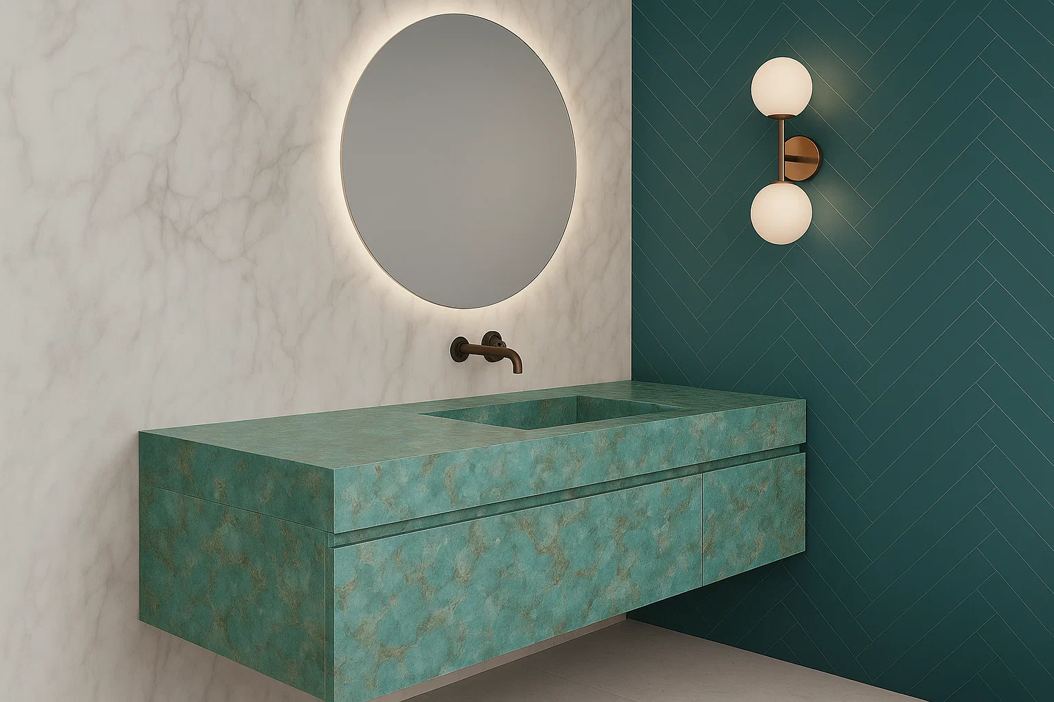 Unsere Keramikkollektion ist wie eine exotische Reise durch eine breite Palette von mehreren hundert Farben, Mustern und Oberflächenarten. Sollten Sie unsicher sein, welches Dekor am besten zu Ihnen passt, senden wir Ihnen gerne eine Visualisierung – Ihre Zufriedenheit steht für uns an erster Stelle. Der Preis für den Waschtisch basiert auf einem beliebigen Dekor aus der Franko-Kollektion (Neolith, Laminam, Dekton, Florim, Silestone – gegen Aufpreis).