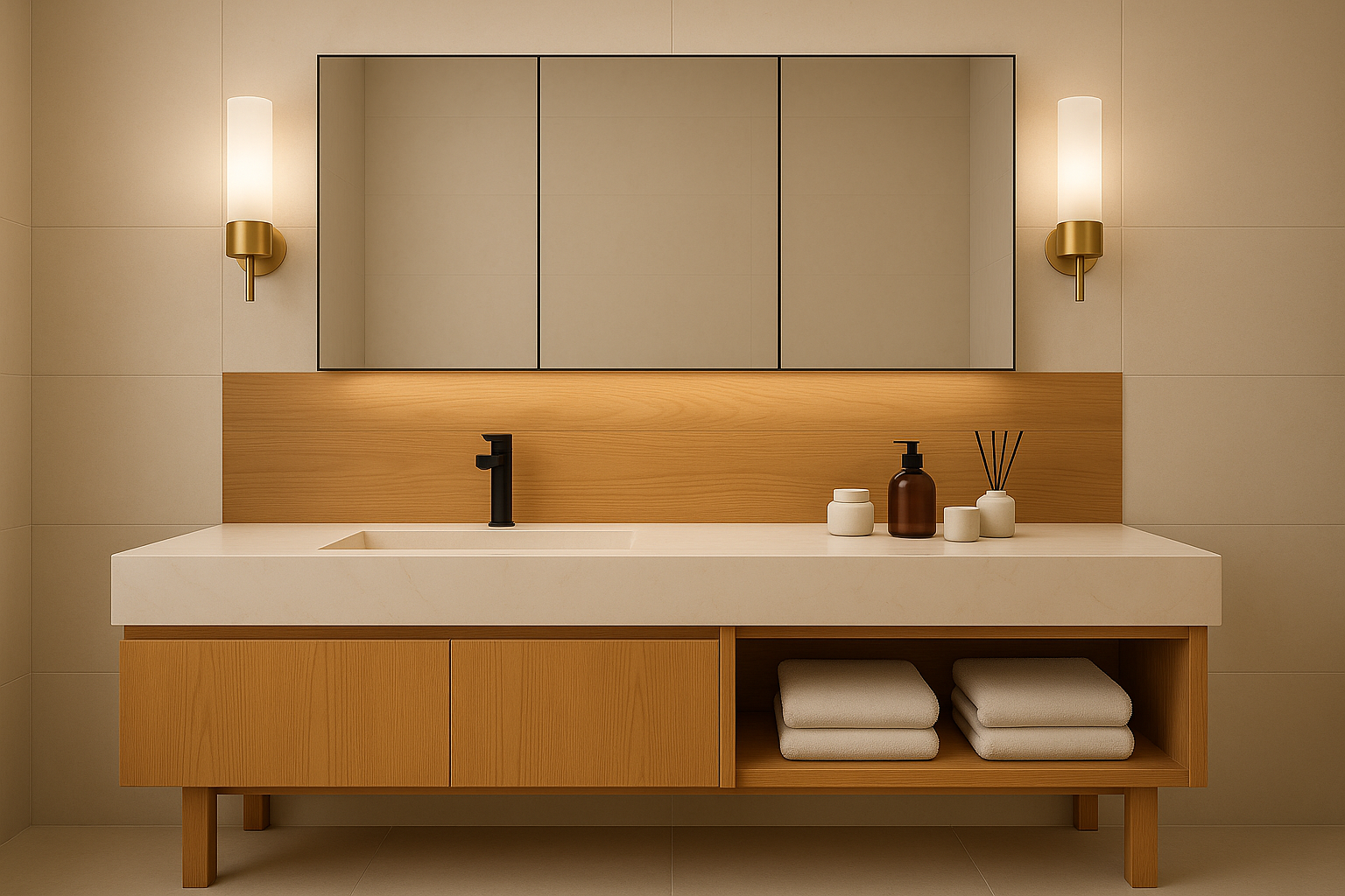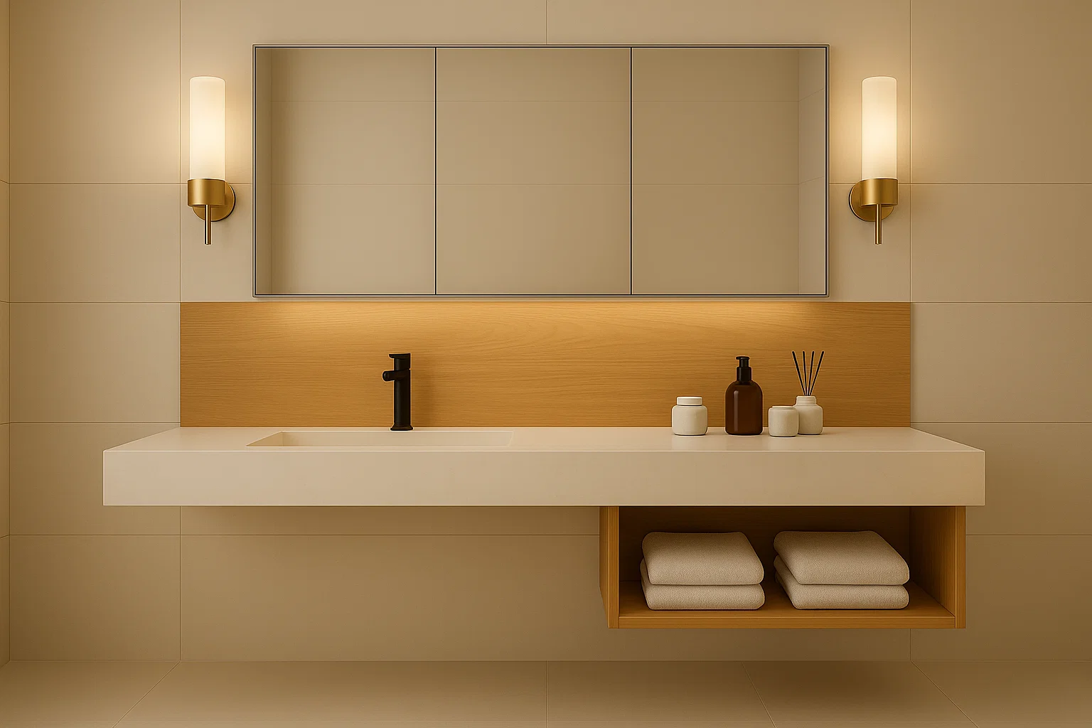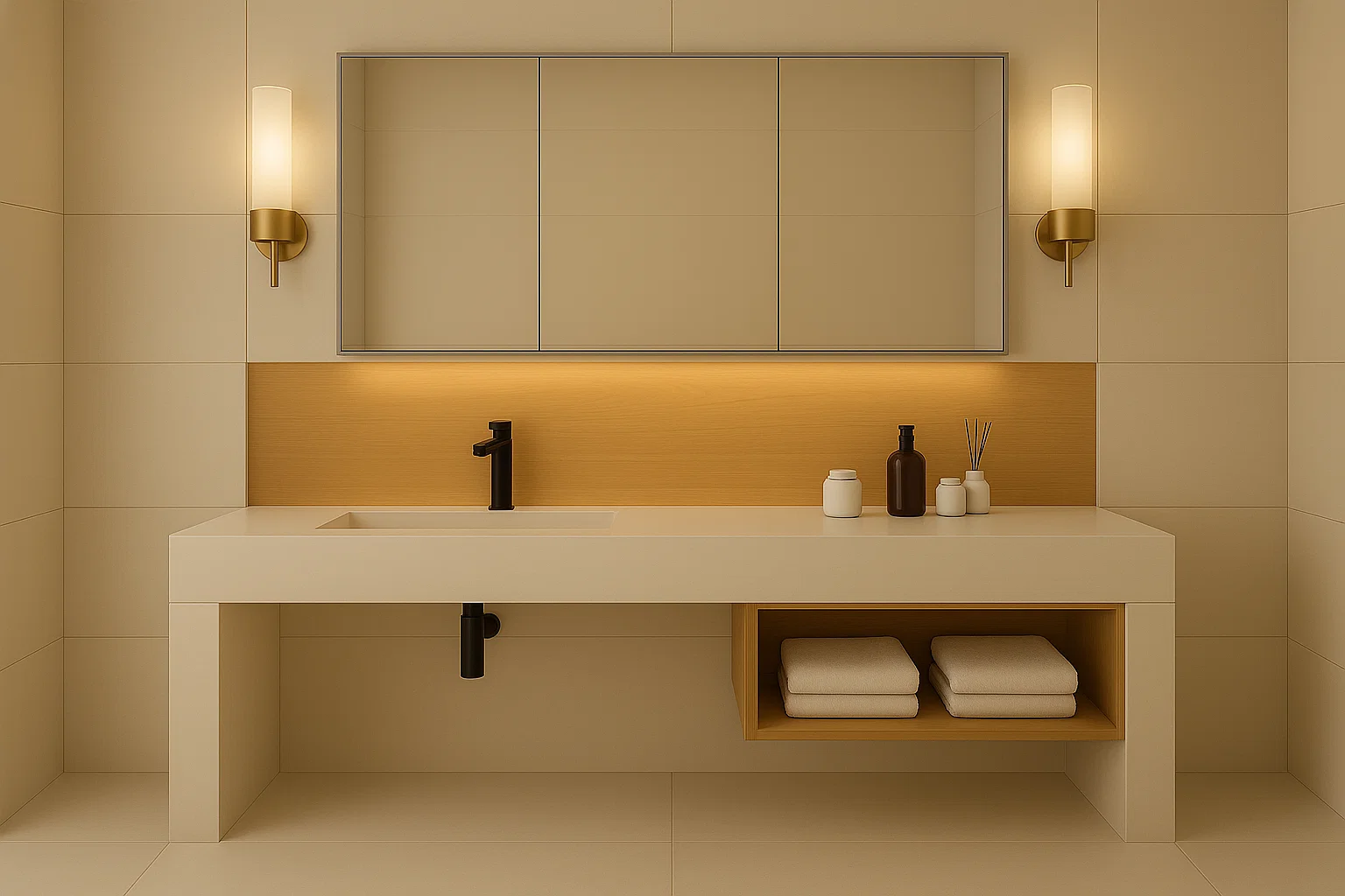 Der Bereich rund um den Waschtisch ist im Badezimmer stets besonders anfällig für Verschmutzungen. Gerne ergänzen wir Ihren Waschtisch mit integriertem Waschbecken um eine passgenaue Rückwand (Spritzschutz) aus großformatiger Keramikplatte.