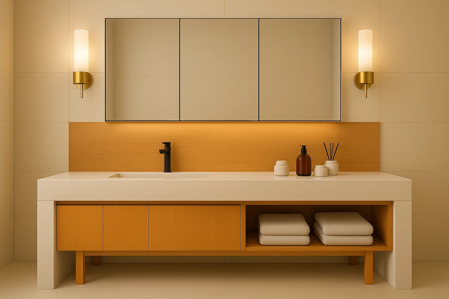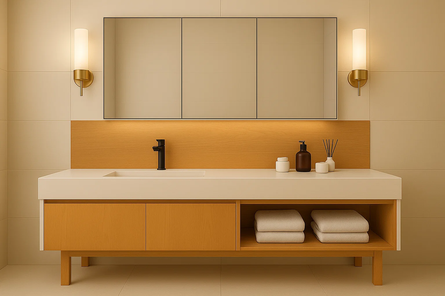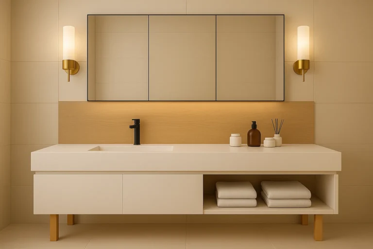 Der Bereich rund um den Waschtisch ist im Badezimmer stets besonders anfällig für Verschmutzungen. Gerne ergänzen wir Ihren Waschtisch mit integriertem Waschbecken um eine passgenaue Rückwand (Spritzschutz) aus großformatiger Keramikplatte.