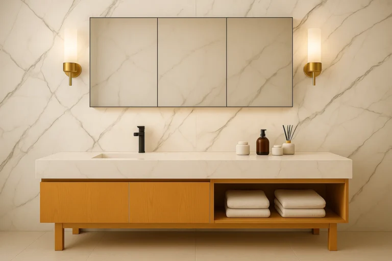 Das Badezimmer Ihrer Träume ist nicht nur eine schöne Waschtischplatte, sondern auch Wand- und Bodenverkleidungen aus großformatigen Keramikplatten oder Naturstein. Der Einsatz von großformatigen Keramikplatten sorgt dafür, dass das Bad nahezu fugenlos und sehr pflegeleicht ist. Besonders schön wirken die Keramikplatten im Bereich der Dusche und der Badewanne. In der Dusche plant man häufig Nischen oder kleine Ablagen für Kosmetikprodukte. Das gesamte Badezimmer sieht einfach fantastisch aus.